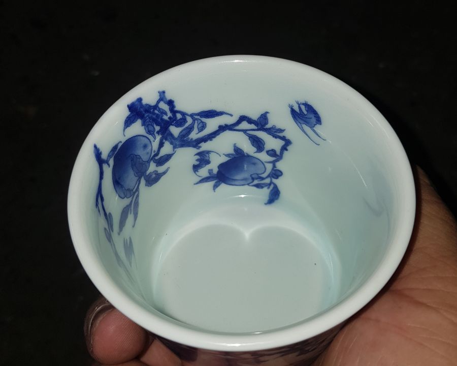 Chén sứ men lam nhất thi nhất họa điển tích tiểu đồng hái đào trường thọ. Chén miệng 8cm. cao 6.5cm. GL385k