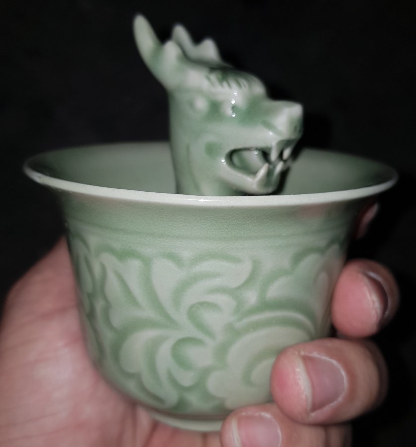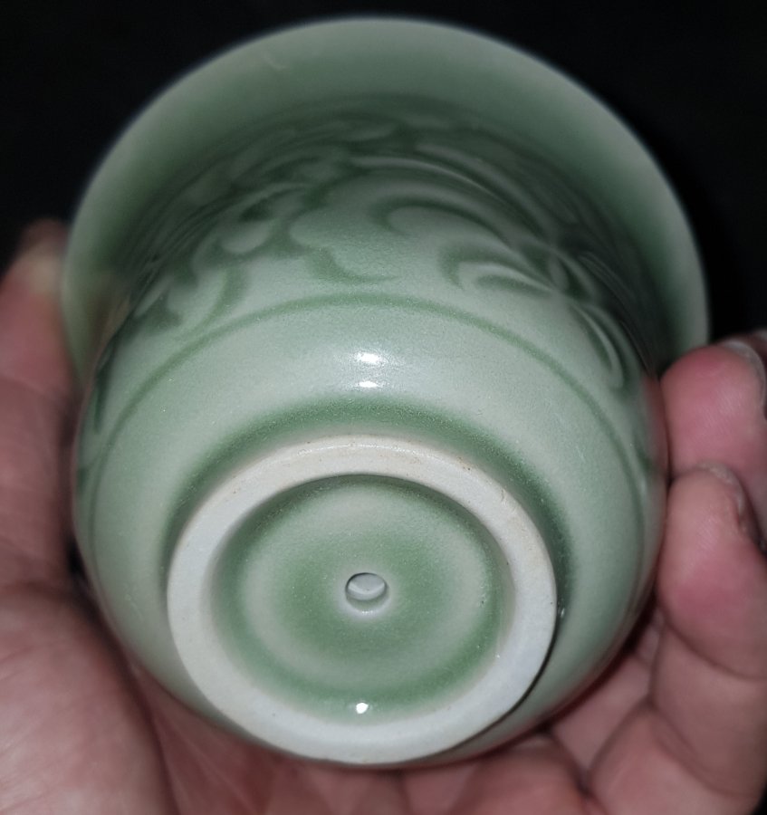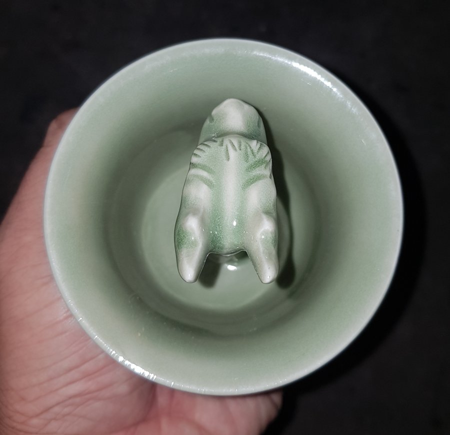 Chén tham thì thâm men Celadon có chiều cao tổng thể 10.5cm. đường kính miệng 9.7cm. Lành lặn. GL950k