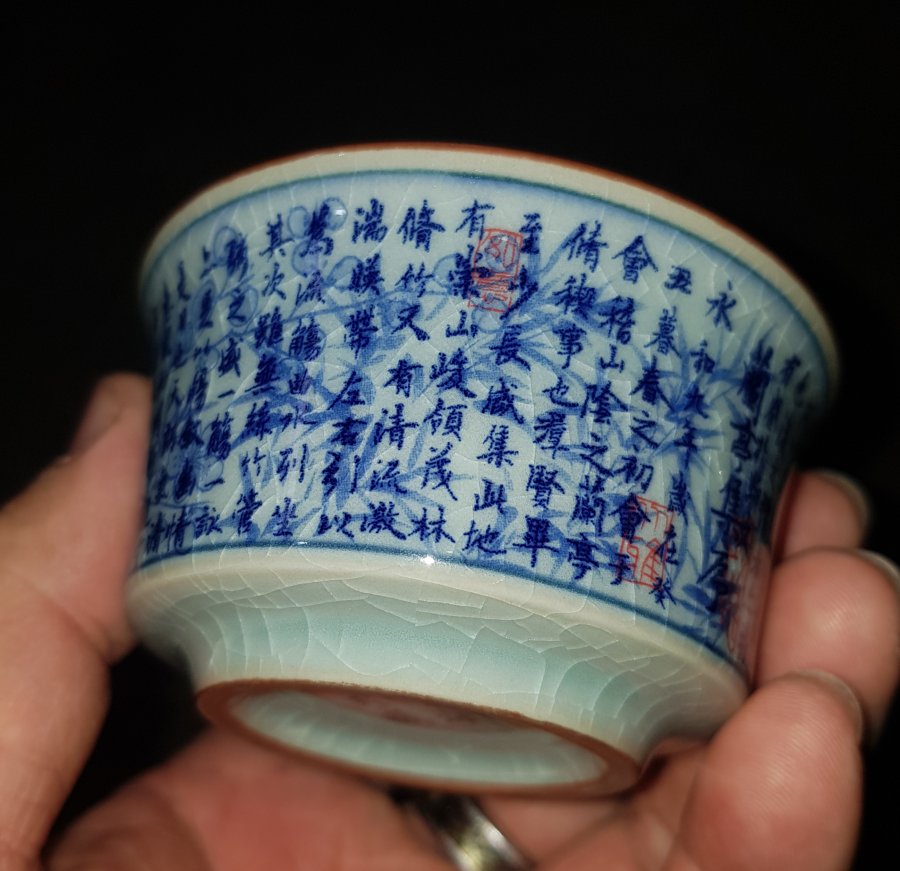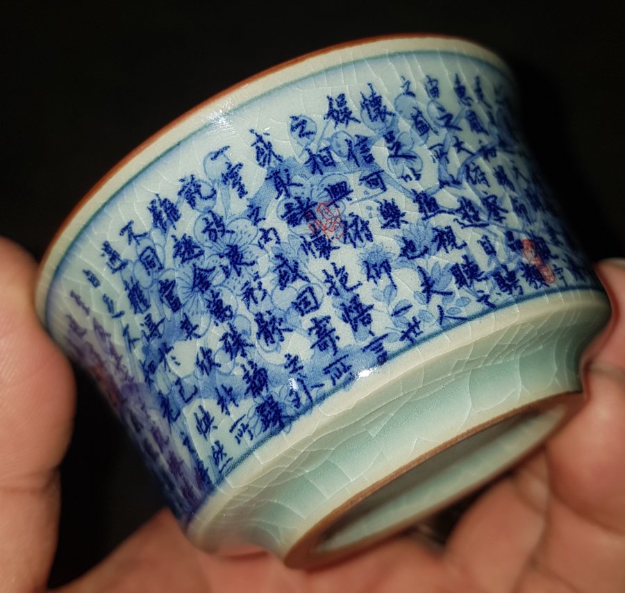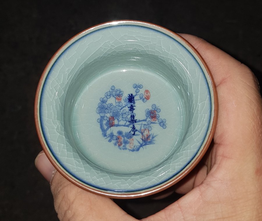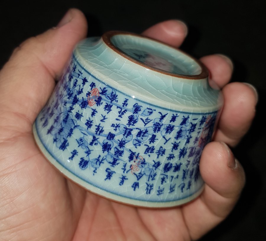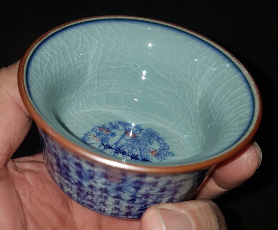 Chén trà dang đẹp họa pháp thư pháp trên nền mai hoa đồ. Chén có đường kính miệng 7.9cm. cao 4.5cm. Lành lặn. GL385k
