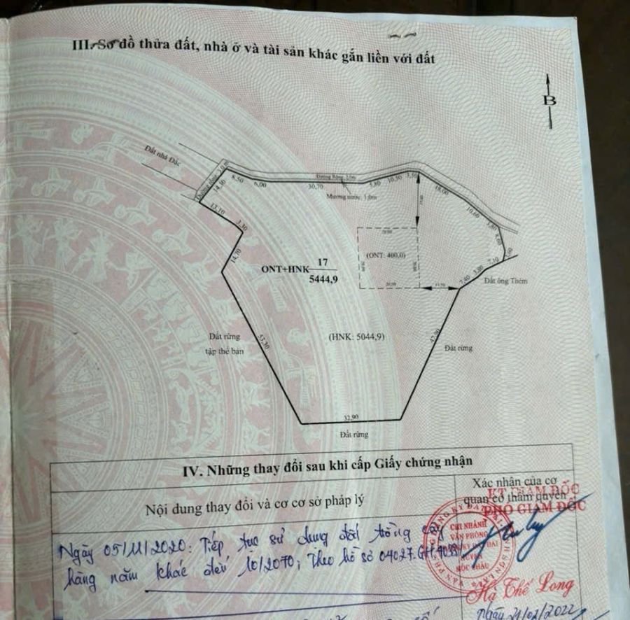 Diện tích: 5444,9m² có 400m2 là đất thổ cư, còn lại là đất trồng cây lâu năm, rộng rãi, thoáng mát.