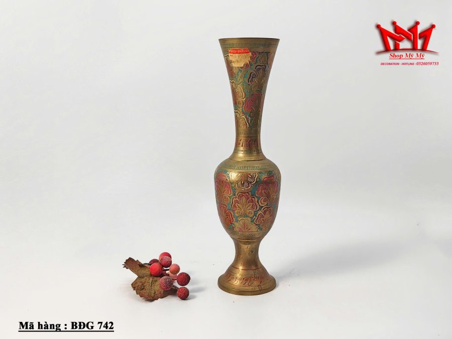 Chiếc bình hoa bằng đồng cổ cao hoạ tiết bông hoa nổi bật