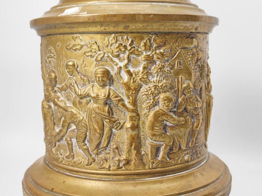 chiếc đèn dầu bằng đồng với các chi tiết chạm khắc nổi bật.
