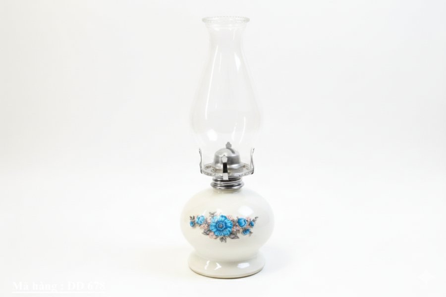Đèn dầu cổ điển với thân sứ trắng hoa xanh + bóng thủy tinh. Kích thước: 37x12 cm. Trọng lượng: 850g. Giá: 890.000₫