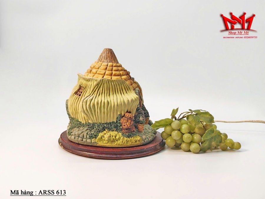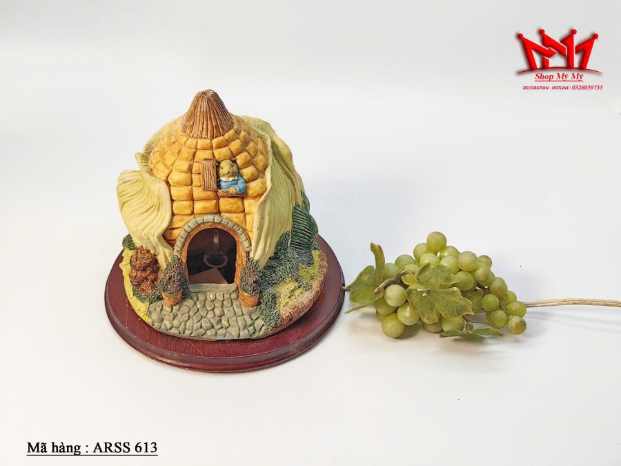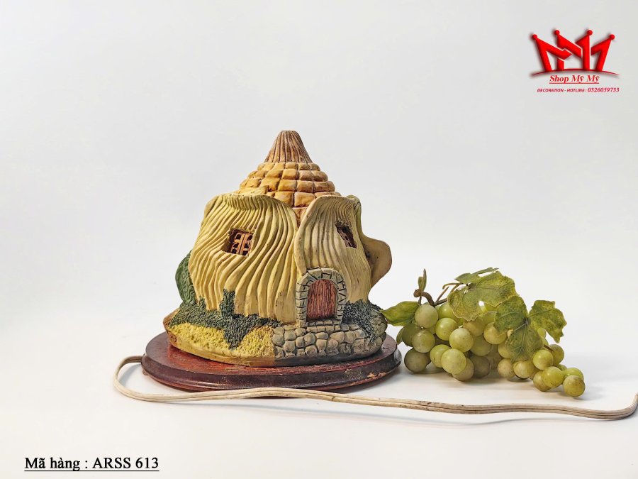 Chiếc đèn ngủ hình ngôi nhà nấm bằng sành sứ đế bằng gỗ