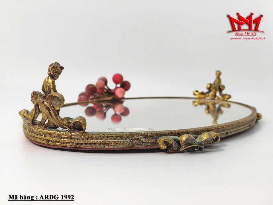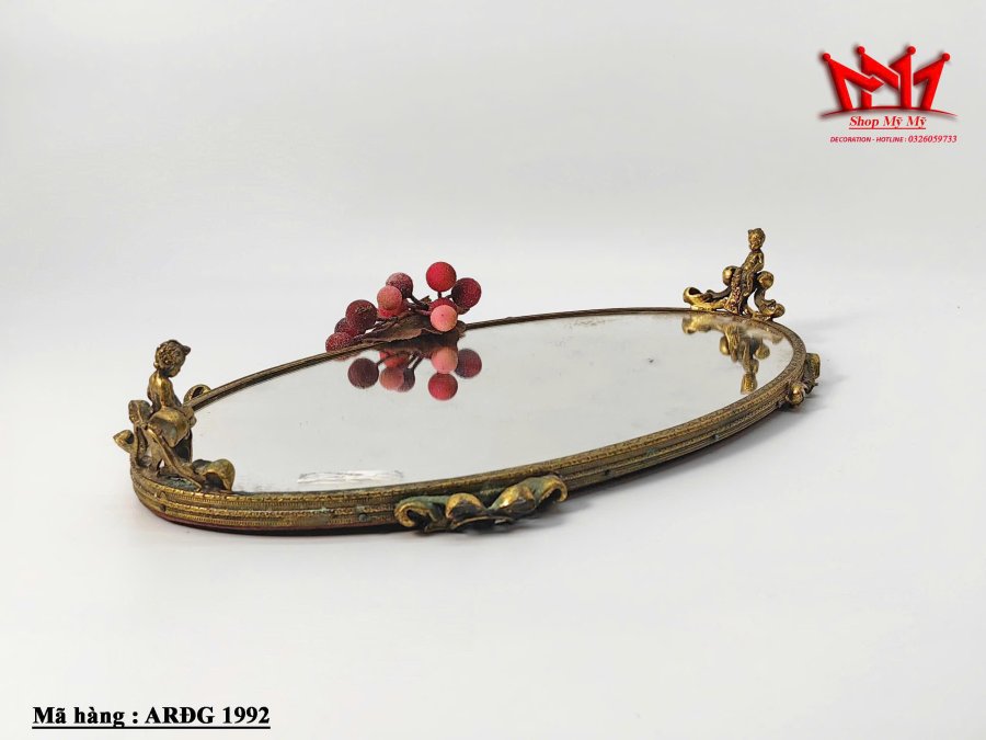 Chiếc khay có gương hình bầu dục màu vàng bằng đồng