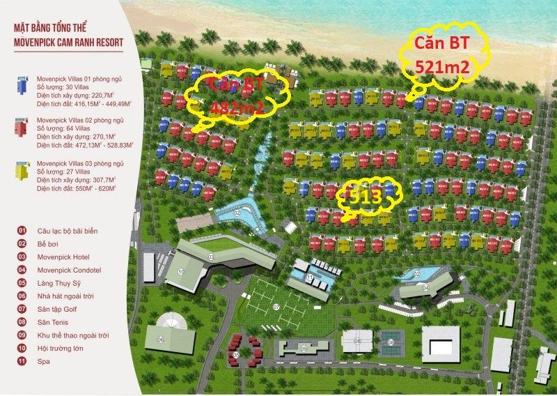 + Biệt thự 1: - Biệt thự Movenpick diện tích 481m², diện tích xây dựng 285,77m². Biệt thự loại 02 phòng ngủ, view đẹp và Căn hộ du lịch Movenpick tặng kèm có diện tích 50m² view hướng biển.