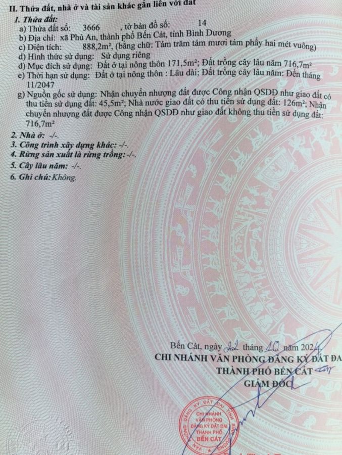 - Diện tích ngang 29 x 30 ,tổng 830 m2, thổ cư 171m2.