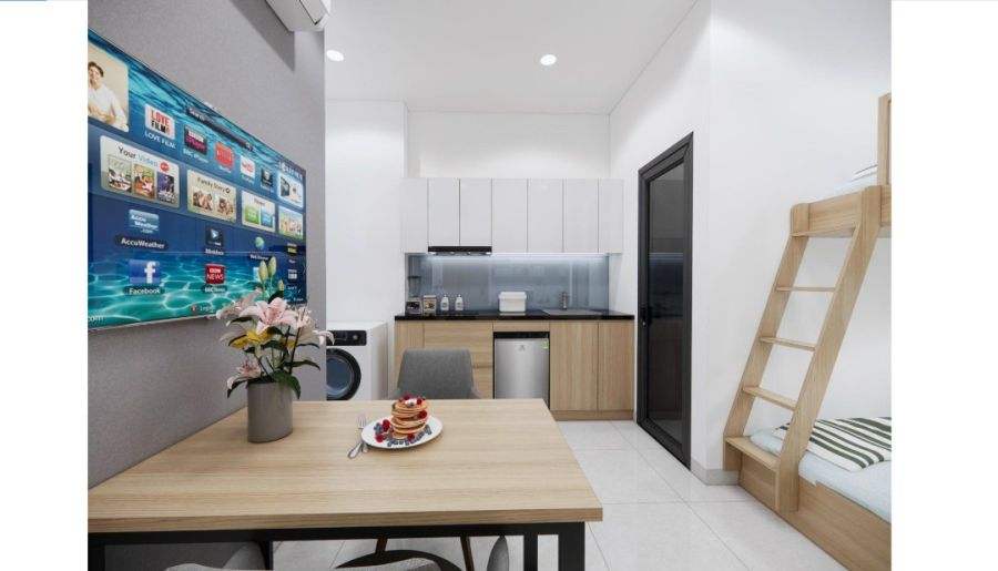 Căn hộ mini full nội thất bao gồm thiết bị điện: Máy giặt, bếp, máy lạnh,...