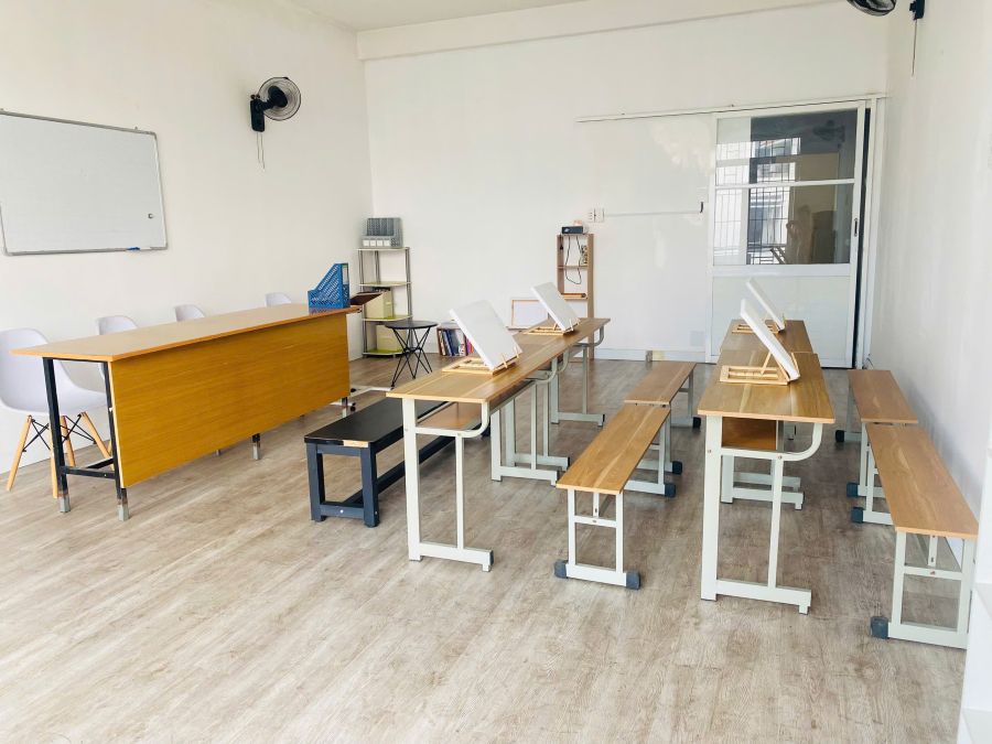 + Có máy chiếu, kệ sách, khay đựng tài liệu, bảng, bút lông dạy học, giá vẽ, hỗ trợ khung tranh Canvas nếu dạy vẽ.