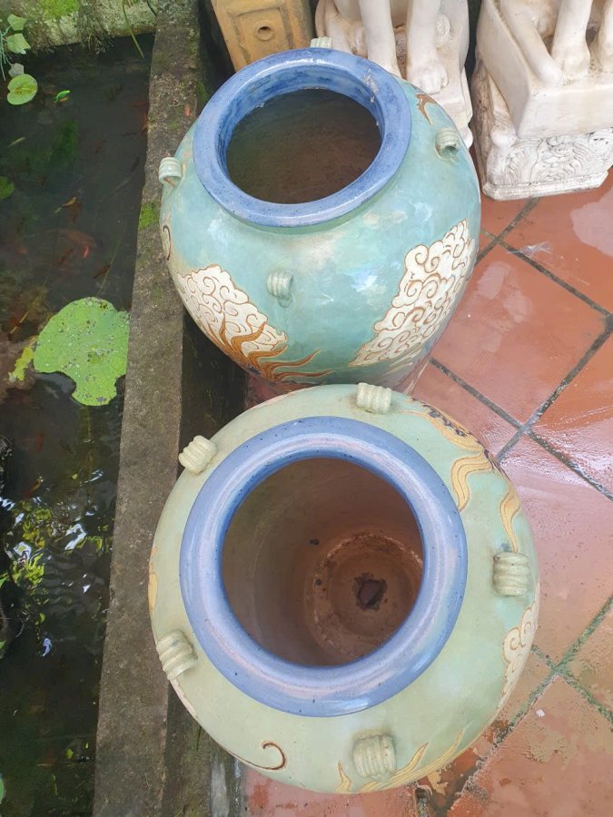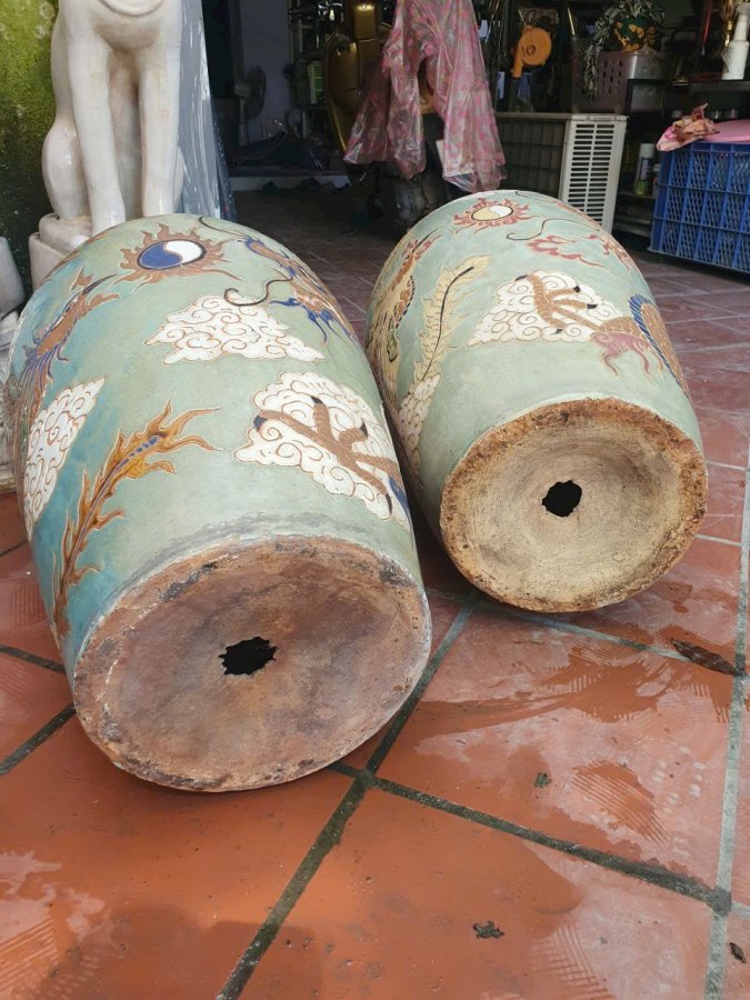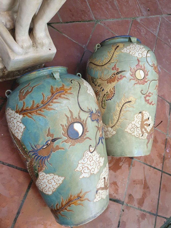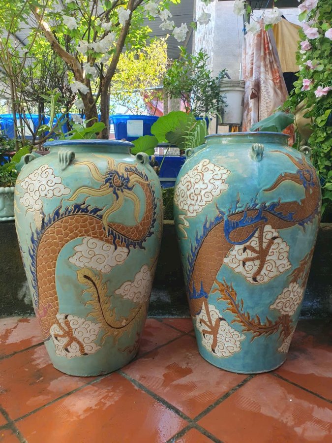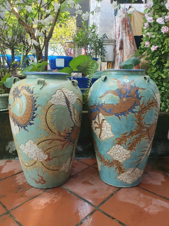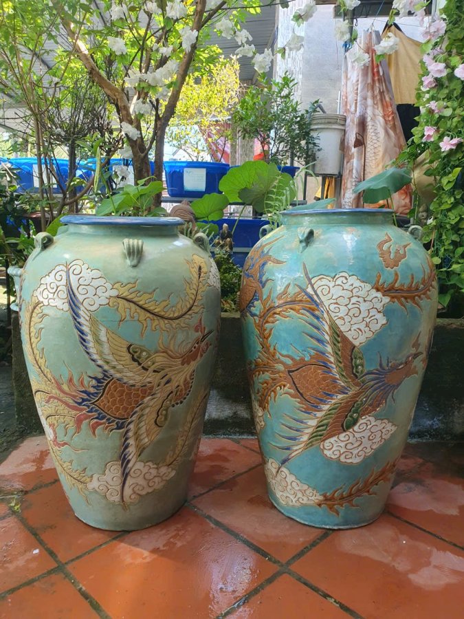 Chóe Long Phụng Hòa Minh gốm Biên Hòa chuẩn xưa trước 75,nổi tiếng với màu men "xanh đồng trổ bông".Cao 69,5cm*25cm*135cm.Người sử dụng xưa khoét lỗ trồng cây.