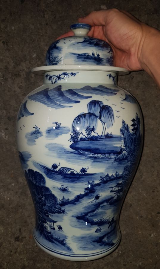 Chóe men lam chàm hồi vẽ mãn họa sơn thủy kín xung quanh. chóe cao 41cm. vòng bụng 71cm. lành lặn. GL4550k