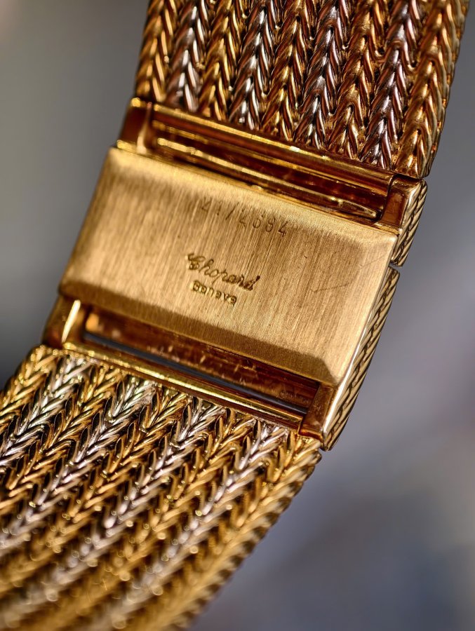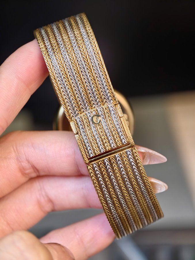 Mặt số vàng đính 12 viên kim cương nổi, vành bezel đính kim cương, đường kính vỏ xấp 32mm, sản xuất tại Thụy Sĩ. Mã số tham chiếu: 1159. Dây đeo và khóa bằng vàng đúc 18k hai tông màu trắng và vàng.
