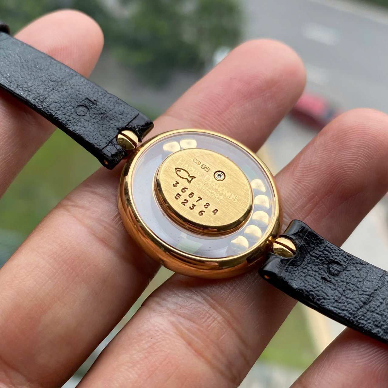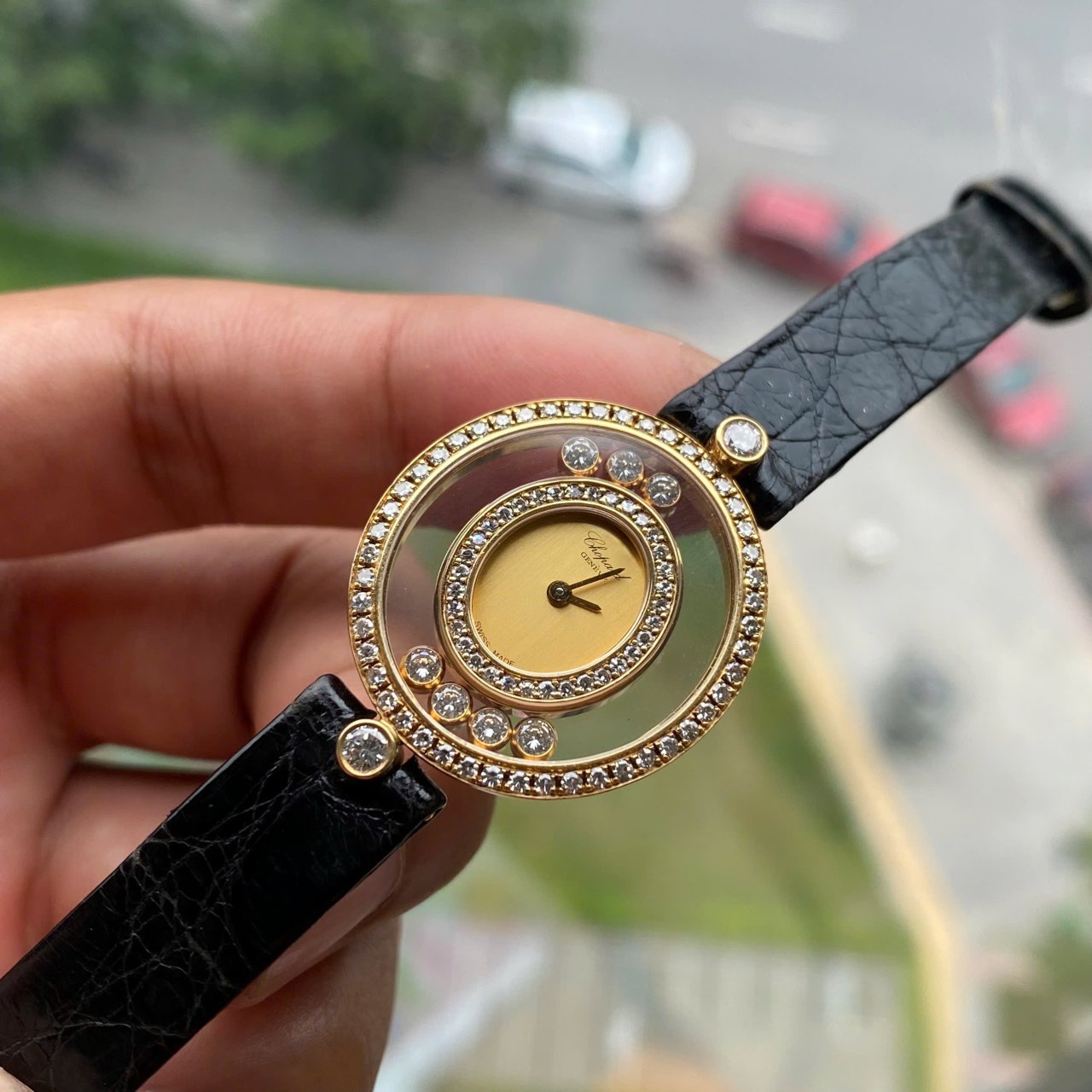 Chopard Happy DiamondVỏ vàng 18k đính full kim cươngMặt số có 5 viên kim chạy vòng quanhSize 26mm