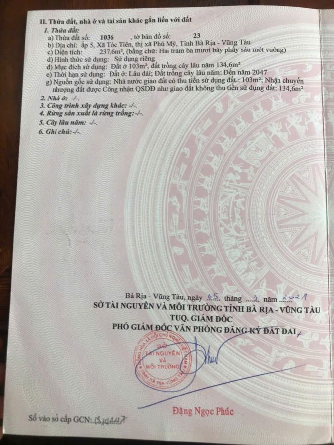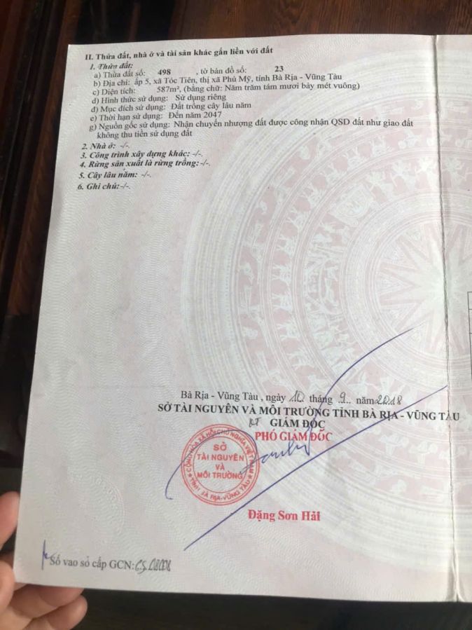 Chủ cần bán 825mv 2 mt 100 thổ cư tóc tiên phú mỹ