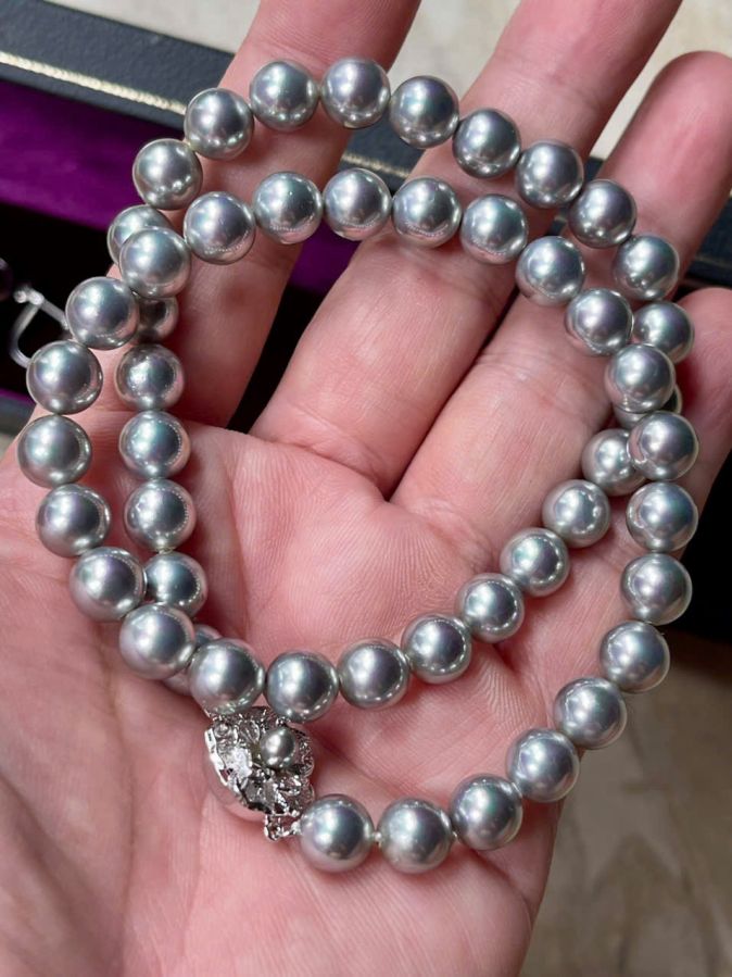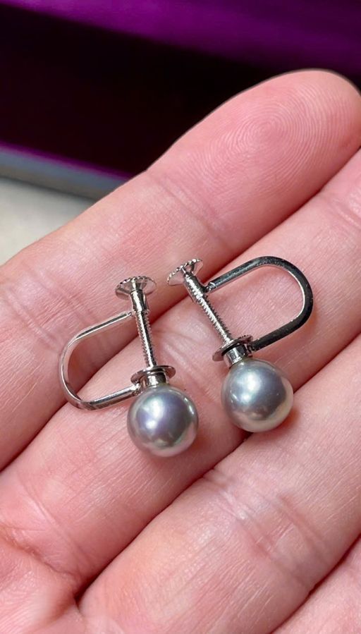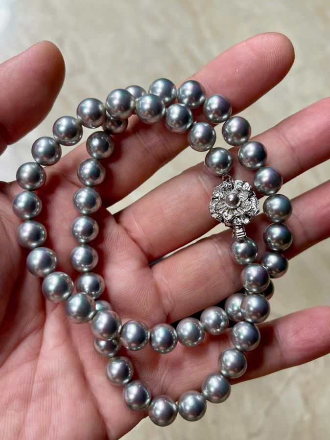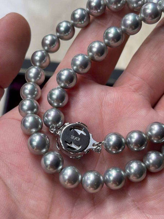 Bộ dây chuyền và bông tai ngọc trai tự nhiên Edison 8ly xám ánh lông công rất đẹp , đều Khoá và gọng bông tay bằng bạc 925 Dài 42,5cm lh 0938968896 zalo or call