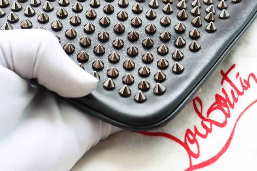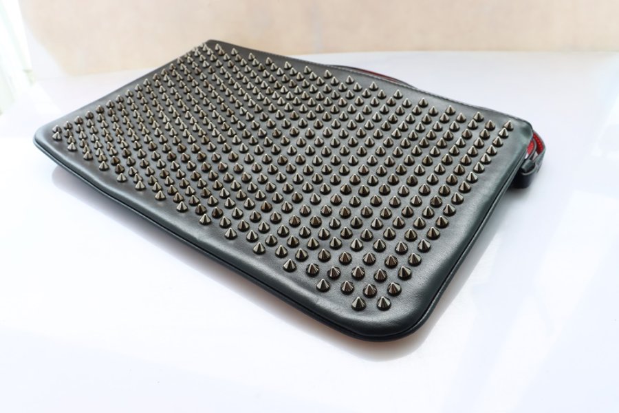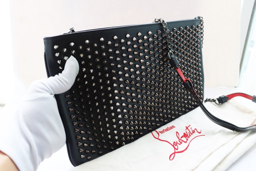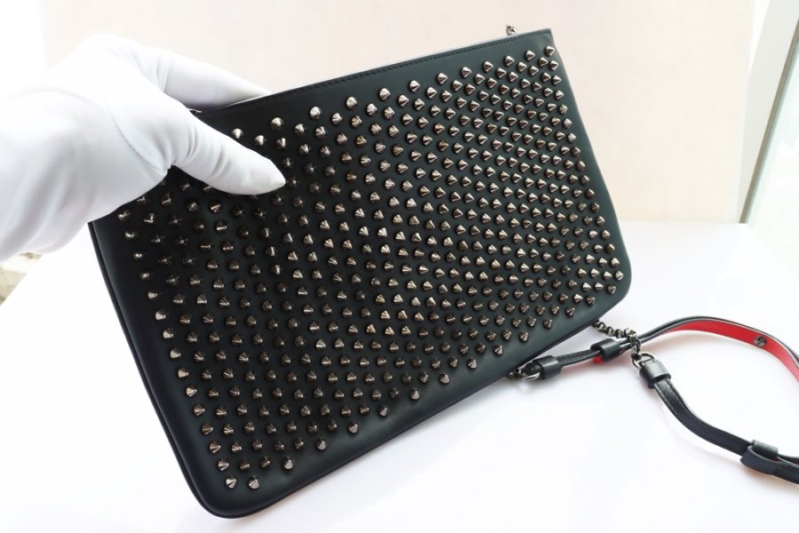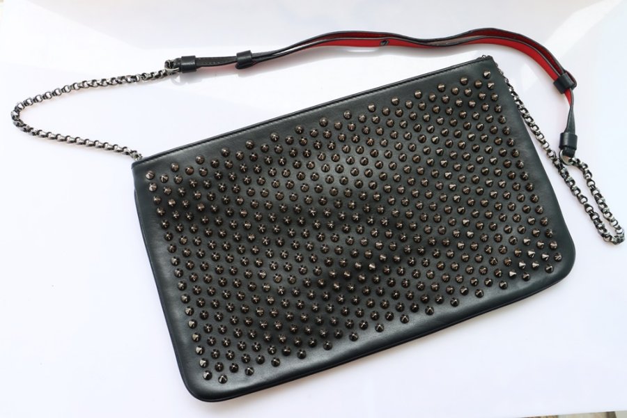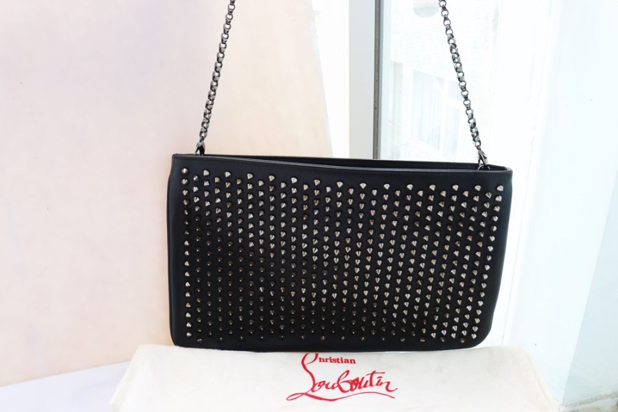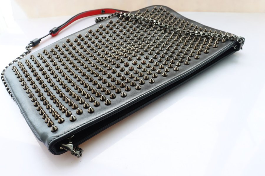 Cluth cầm tay Nữ + dây đeo Louboutin da đen đính đinh tán Full đặc trưng hãng ( Thương hiệu Pháp ) Fullbox...