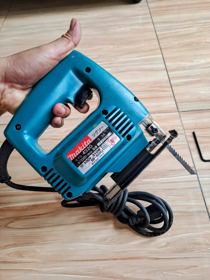 Cưa lọng MAKITA 100V 310W, vẫn giữ được vẻ đẹp như hồi xuất xưởng, nhưng với công suất lớn nên rất mạnh, có điều tốc trên cò, lưỡi cưa gỗ hãng KSK đi kèm, dùng lưỡi thông dụng, ốc giữ lưỡi còn đủ, dây zin Makita mềm như bún, cây lục giác để tháo mở lưỡi được dấu kín dưới thân máy......350k