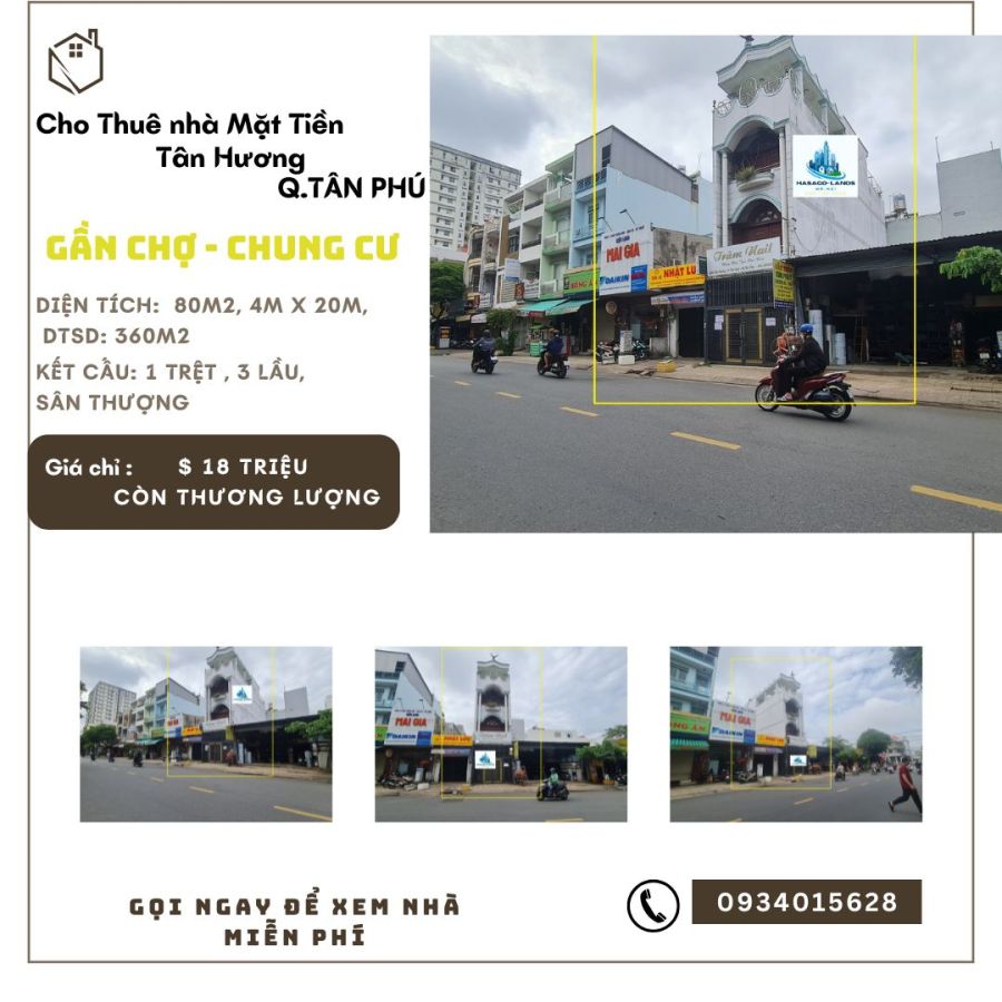 CỰC HIẾM-Cho thuê nhà Mặt Tiền Tân Hương 80m2, 3Lầu+ST, 18 Triệu-Gần CHỢ