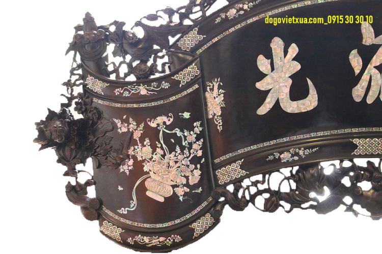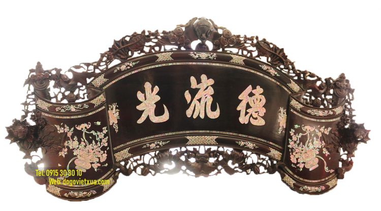 Hôm nay Đồ Gỗ Việt Xưa xin giới thiệu tới quý khách 1 bức Cuốn thư cẩn ốc đỏ vô cùng độc đáo, quý hiếm, giá trị cao, chạm khắc tinh xảo, cẩn ốc xà cừ loại đẹp nhất, nội dung Ý Nghĩa sâu sắc (Ba chữ Đức Lưu Quang và 2 bên là Dơi ngậm lãng hoa).