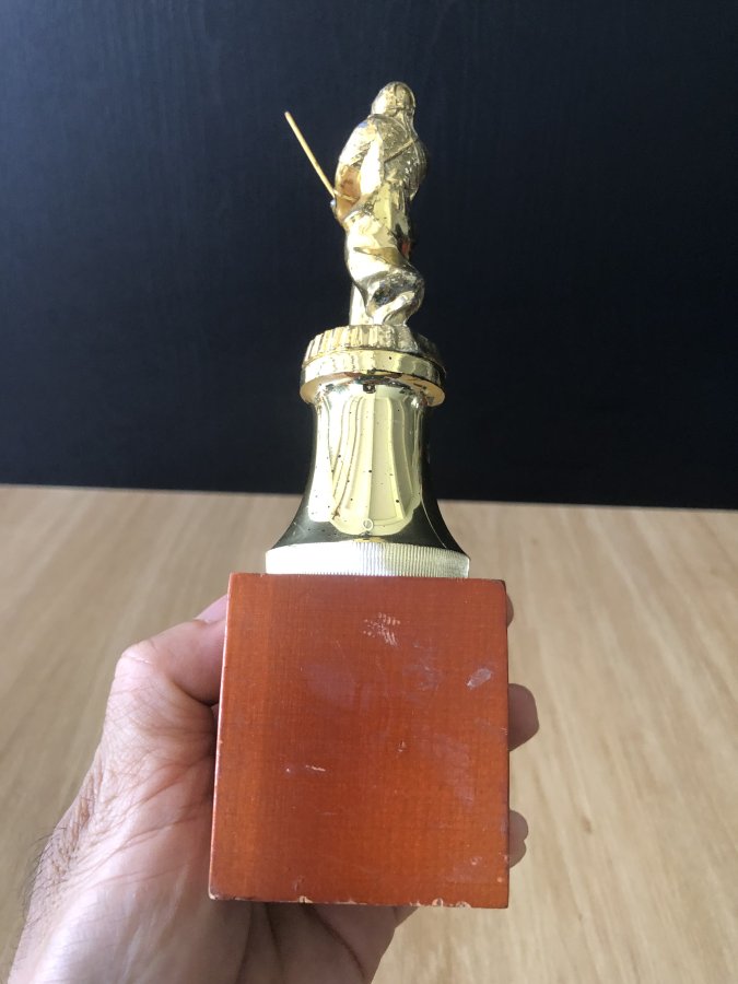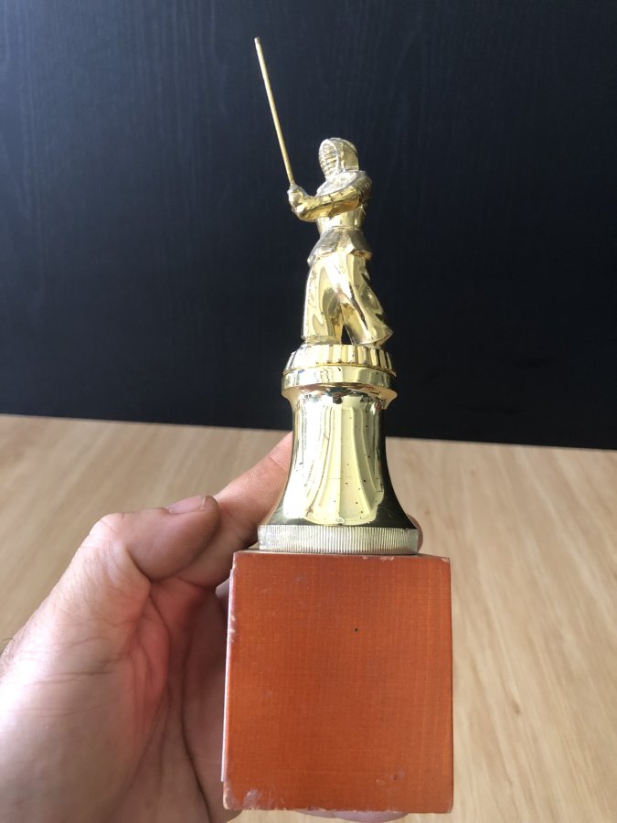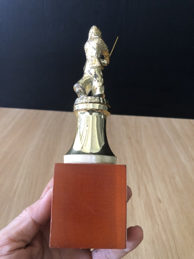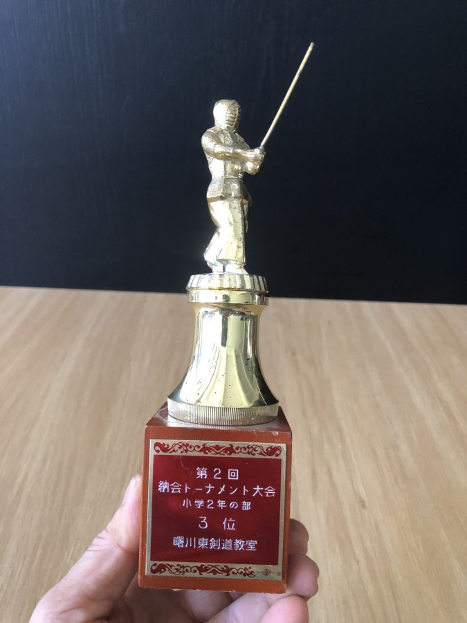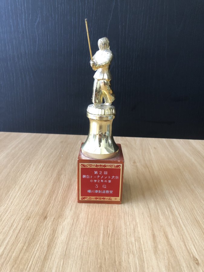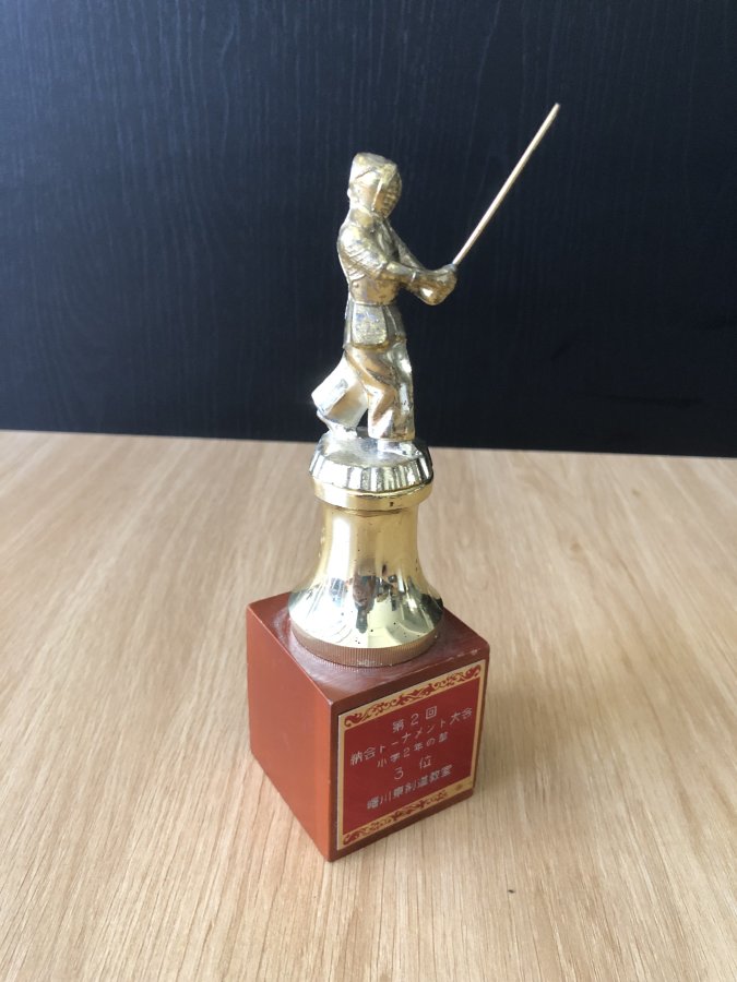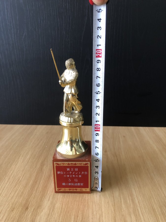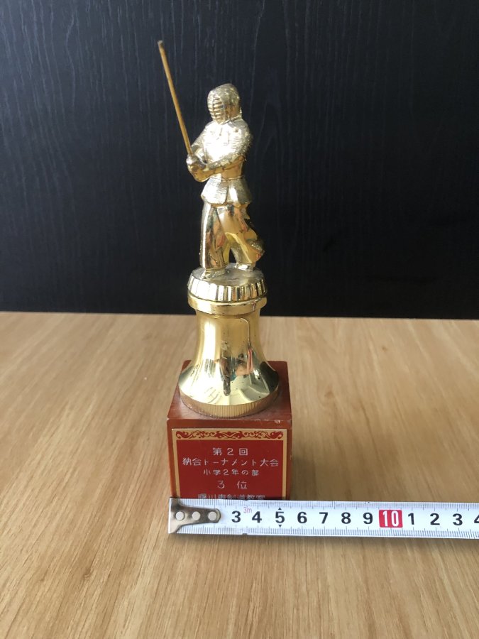 Cúp lưu niệm cho giải đấu kiếm Kendo trường tiểu học dành cho các bé.Kendo(Kiếm đạo)là bộ có nguồn gốc từ Kenjutsu(kiếm thuật cổ truyền của Samurai).Cúp chưa vệ sinh,phần dưới bằng gỗ,phần giữa bằng nhựa,phần trên bằng kim loại không hít nam châm.Cảm ơn đã xem tin