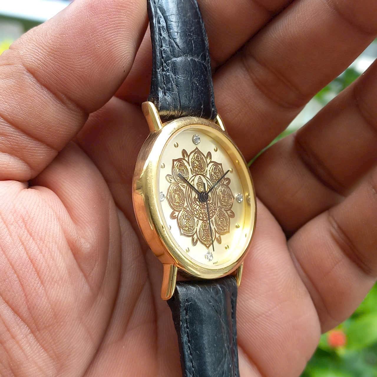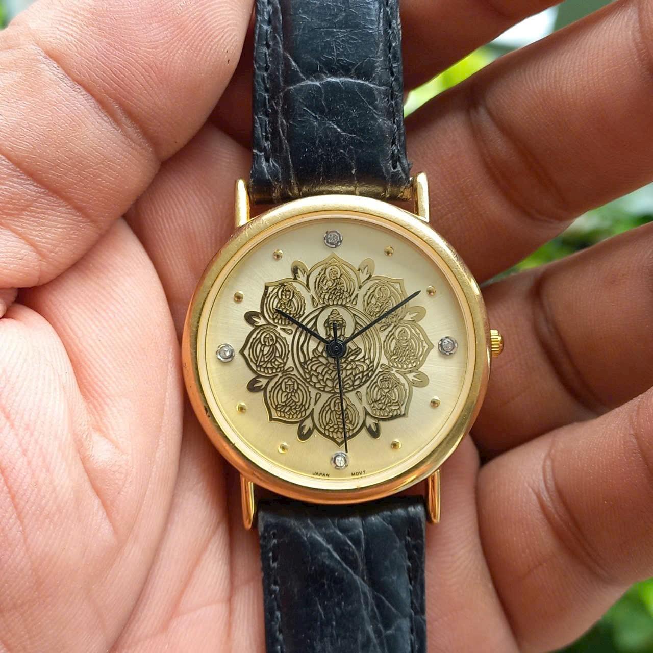 Đồng hồ Tôn giáo Phật giáo chính hãng Nhật Bản nguyên zin 100% - Cơ chế pin hoạt động tốt - Size 33mm chưa tính núm - Toàn thân mạ vàng không bong tróc - Tình trạng không mòn hoặc bong tróc - Chuẩn cho Anh em sưu tầm - Giá sale 678k. Kính mời quý khách.