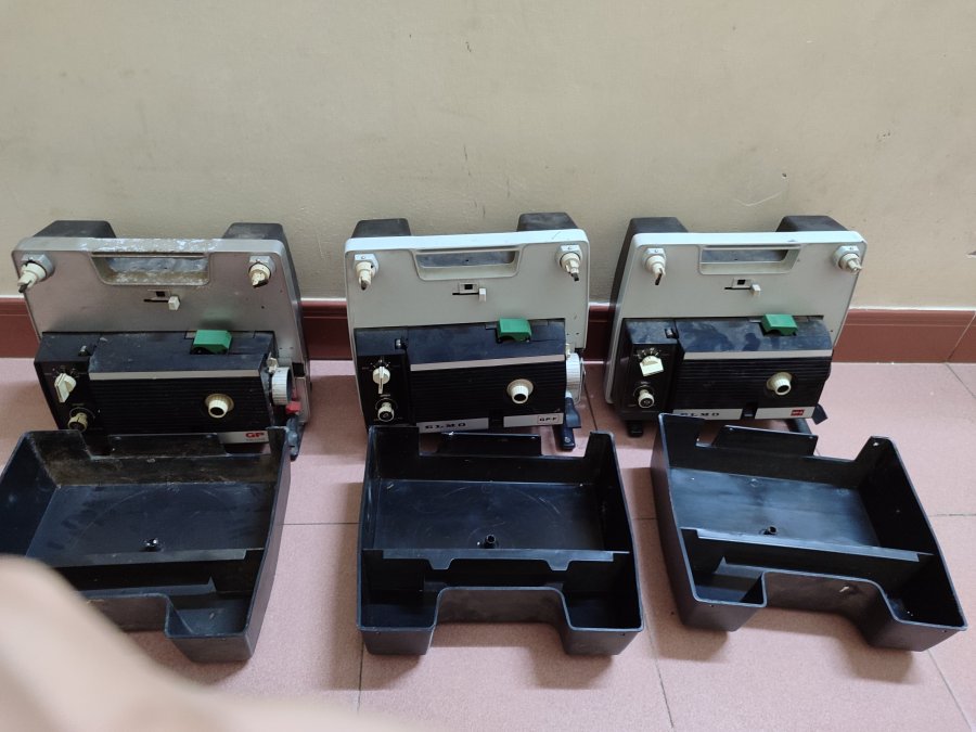 11 máy chiếu phim xưa hàng Nhật dùng điện 100V có 3 cái không hộp, 1 cái bị vỡ nắp phía sau, còn lại lành lặn.Bán bao nguồn, ae mua về vệ sinh, thay cuaro