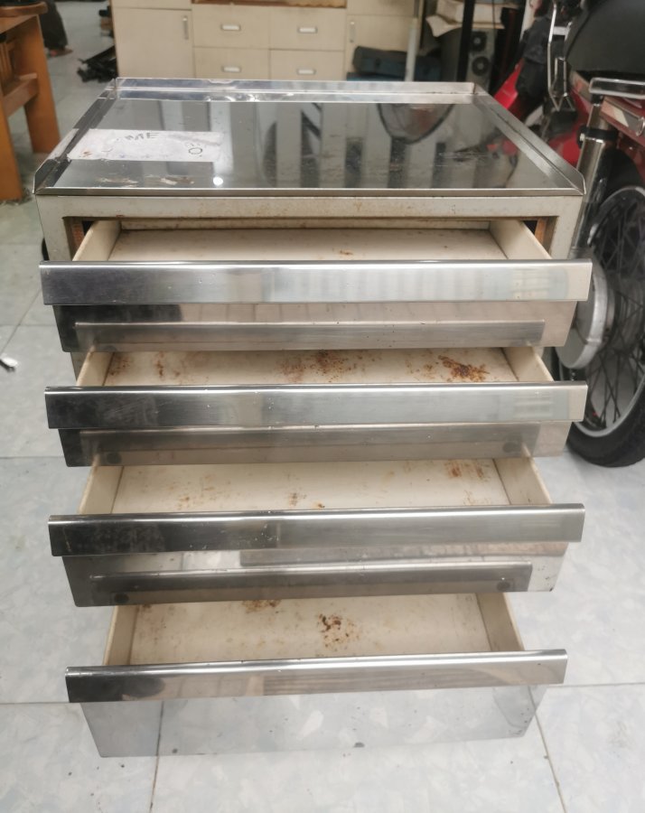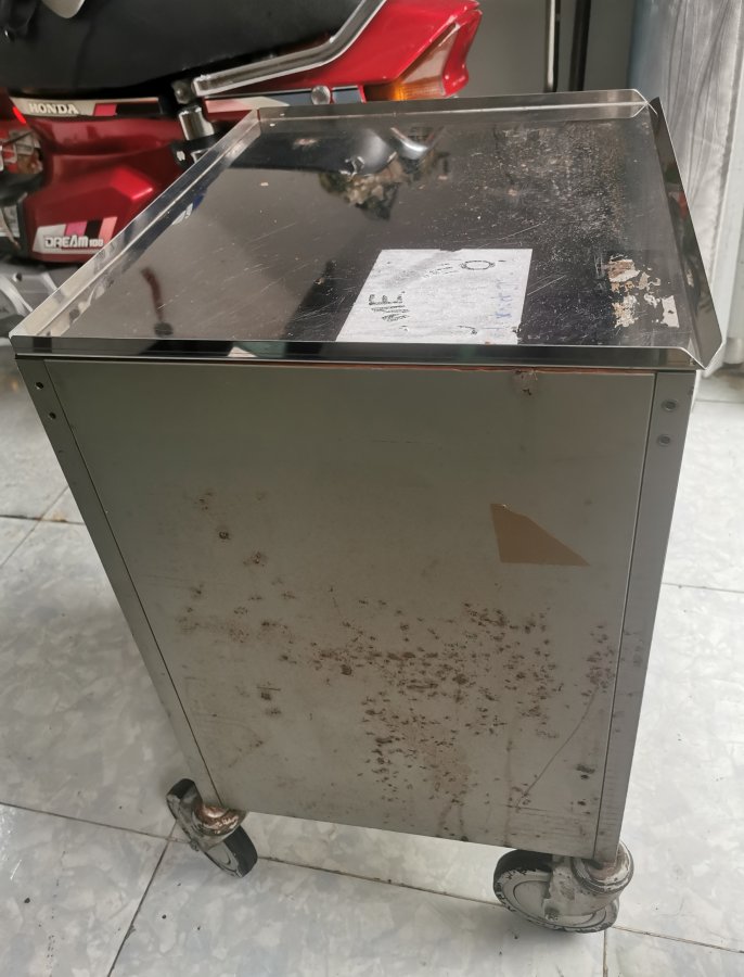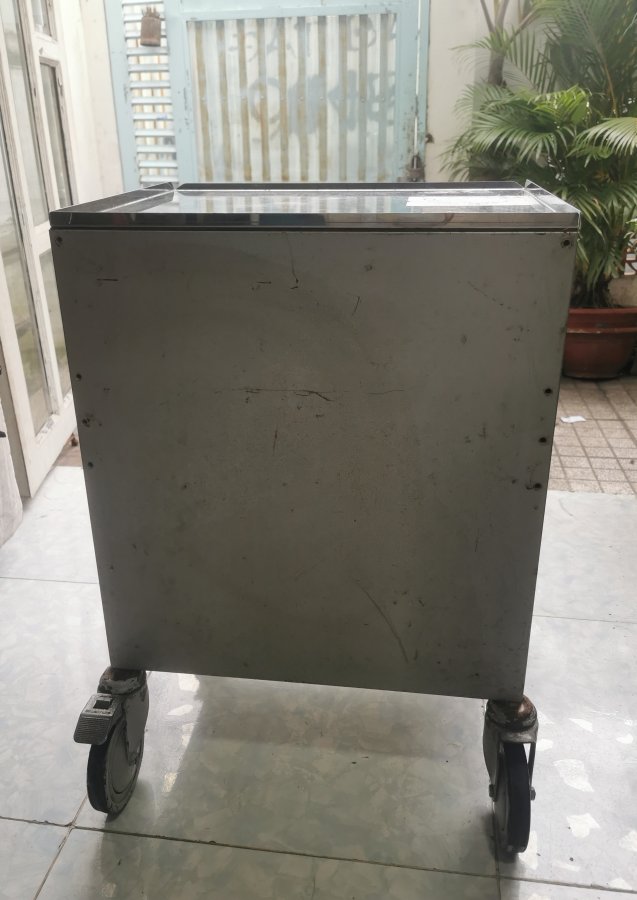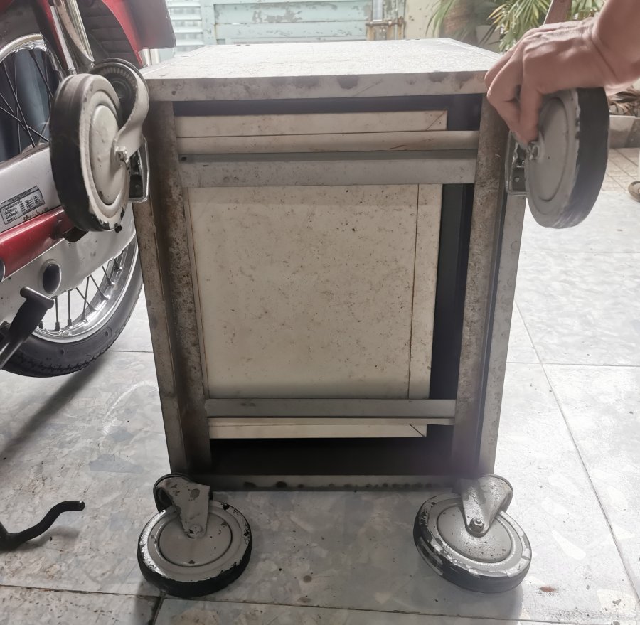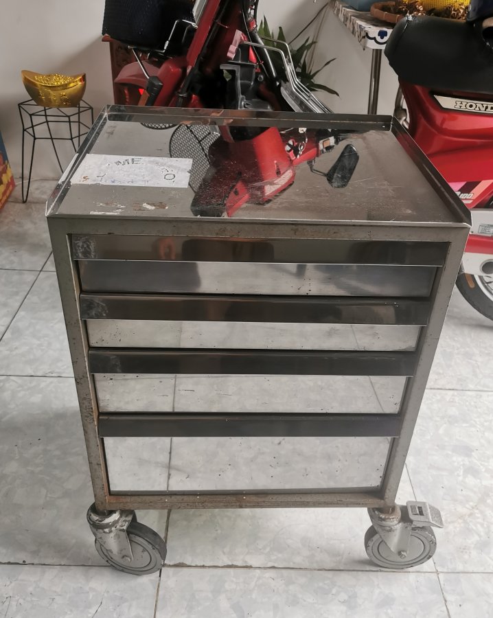 Em lên tủ đựng dụng cụ bằng sắt và inox. 04 hộc tủ không lủng. Bánh xe Steinco Đức có khóa. Kích thước: Cao 70cm cả bánh, sâu 40cm, rộng 50cm. Nặng 32kg. Em ở Hồ Chí Minh. 0708294986 Hoàng Khiếttu