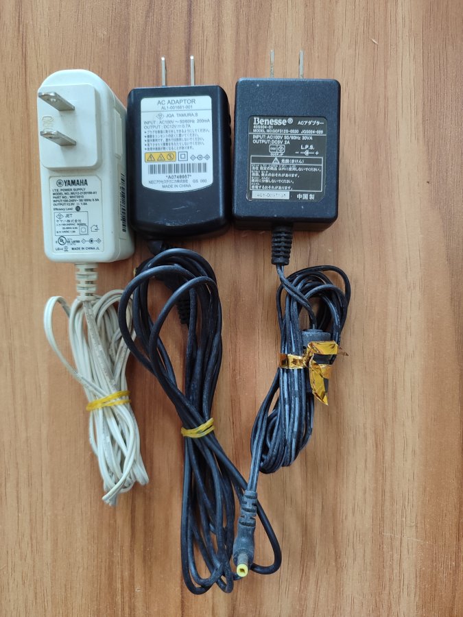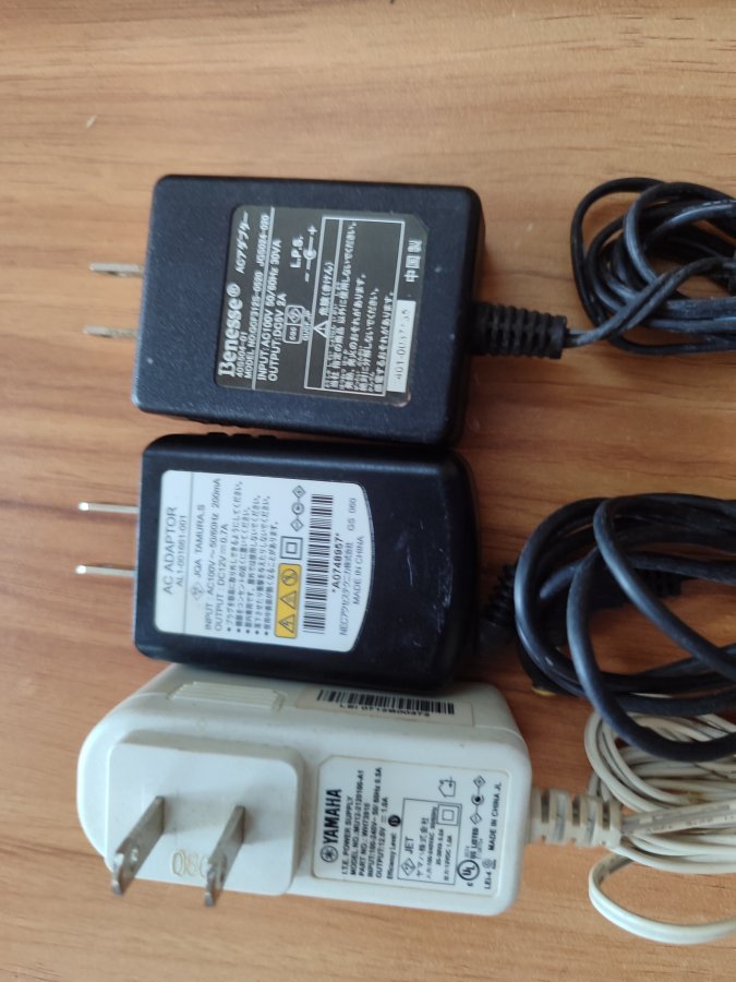 3 adapter hàng Nhật. Cái trắng hiệu Yamaha dùng điện 100V, điện ra 12V 1A, 2 cái còn lại dùng điện 100V, 1 cái 12V 0.7A, 1 cái 5V 2A