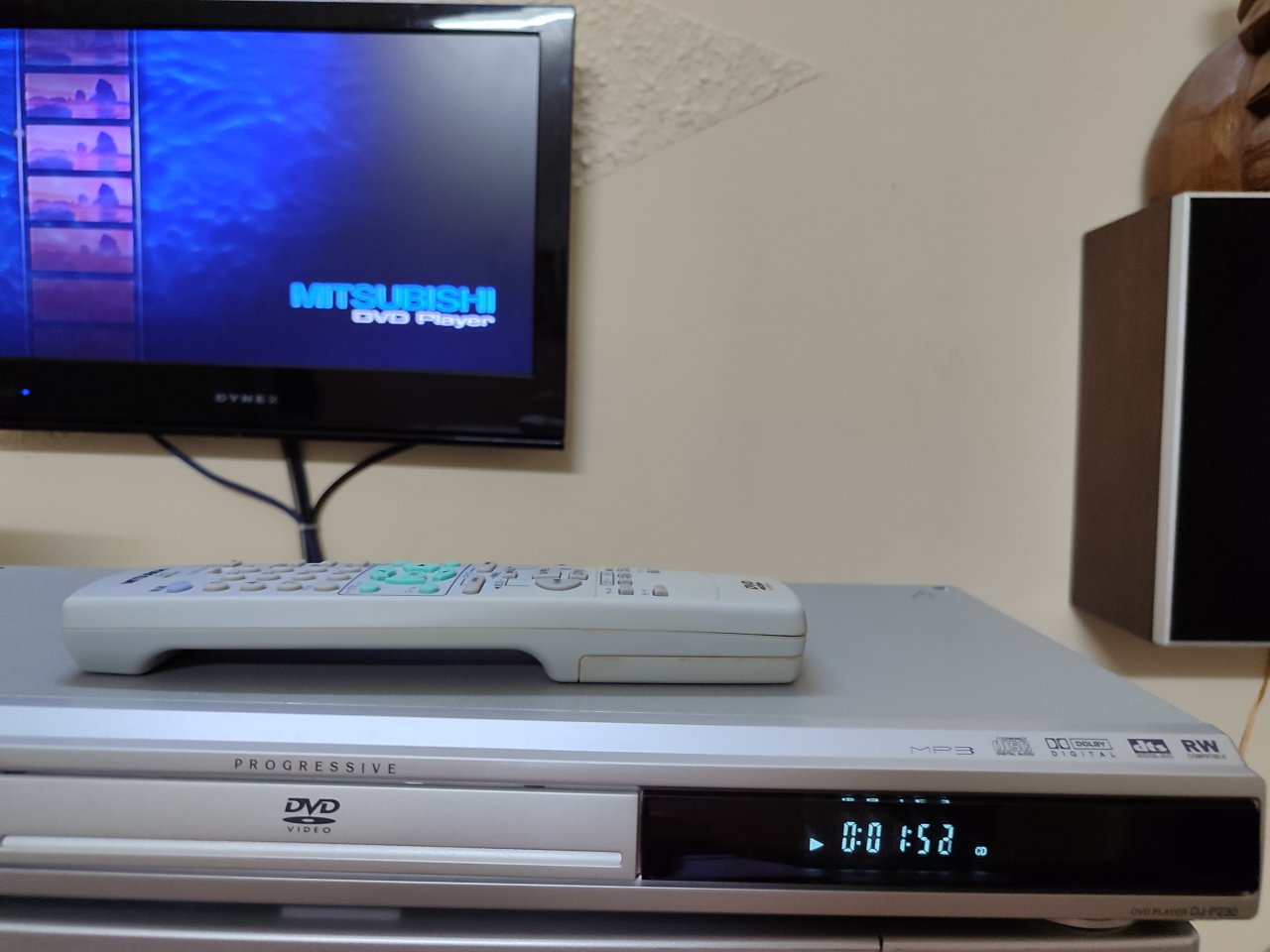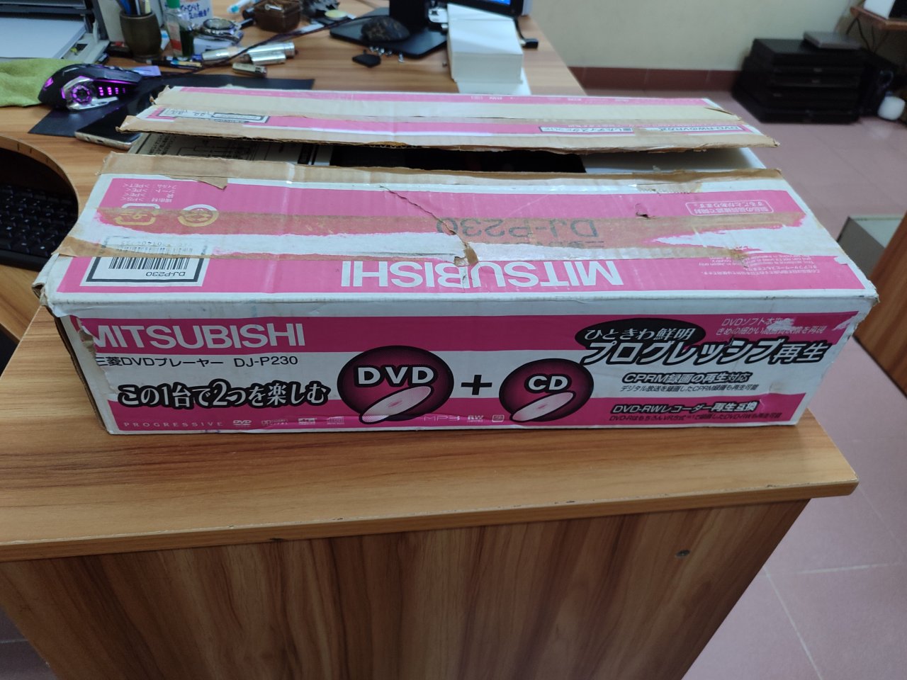 Đầu đĩa DVD Mitsubishi DJ-P230, dùng điện 100V, đầu còn rất mới, còn hộp, remote và dây AV. Đọc tốt DVD, CD. Size ngang 43 cm x 21 x 5 cm.