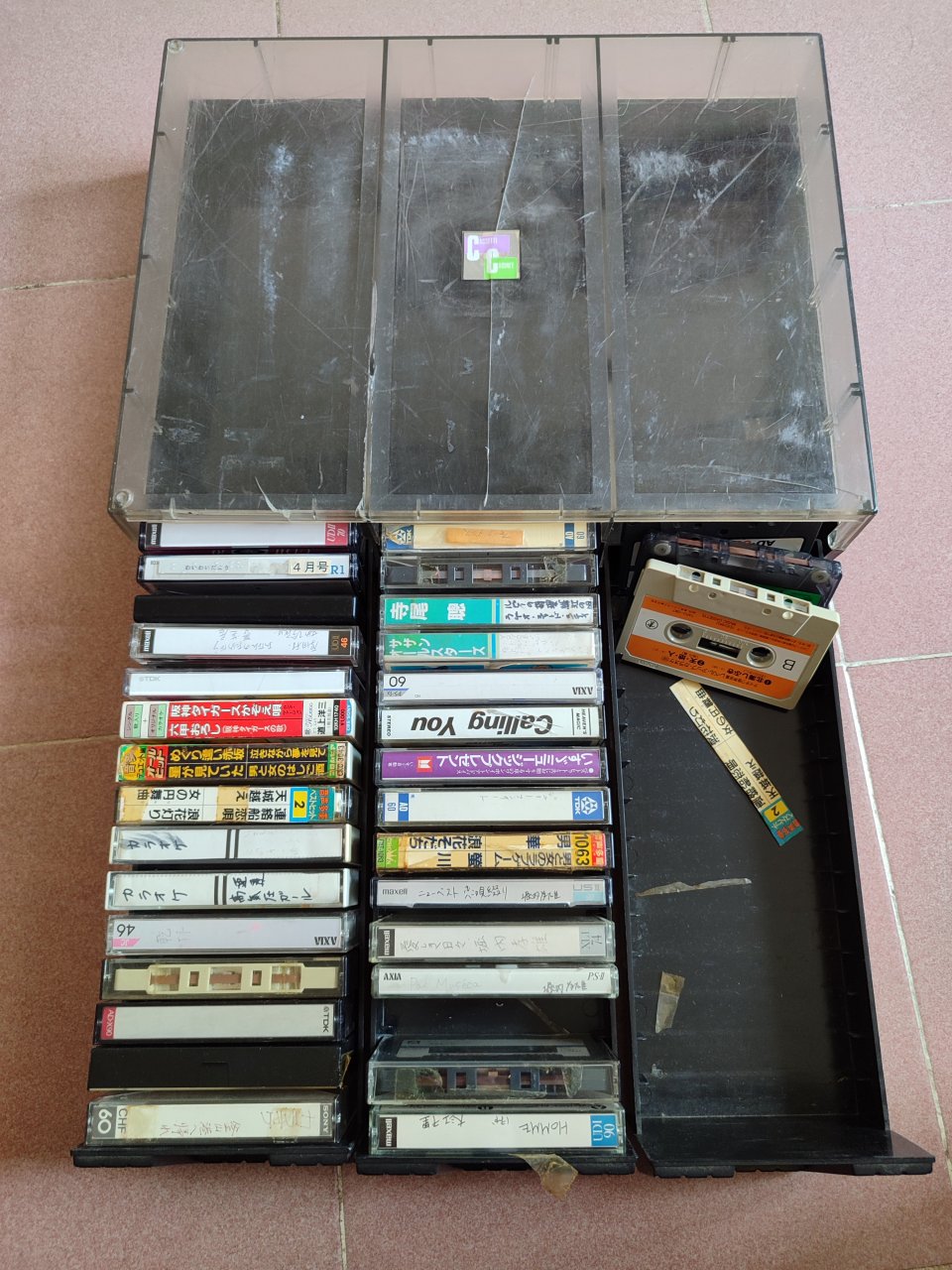 Hộp đưng băng cassette + 32 cuốn băng cassette (3 cuốn không vỏ hộp), băng dài ngắn lộn xộn, ae về tự test, đa phần băng còn đẹp, sợi băng không mốc, nắp hộp coa trầy xước, nứt do vận chuyển.
