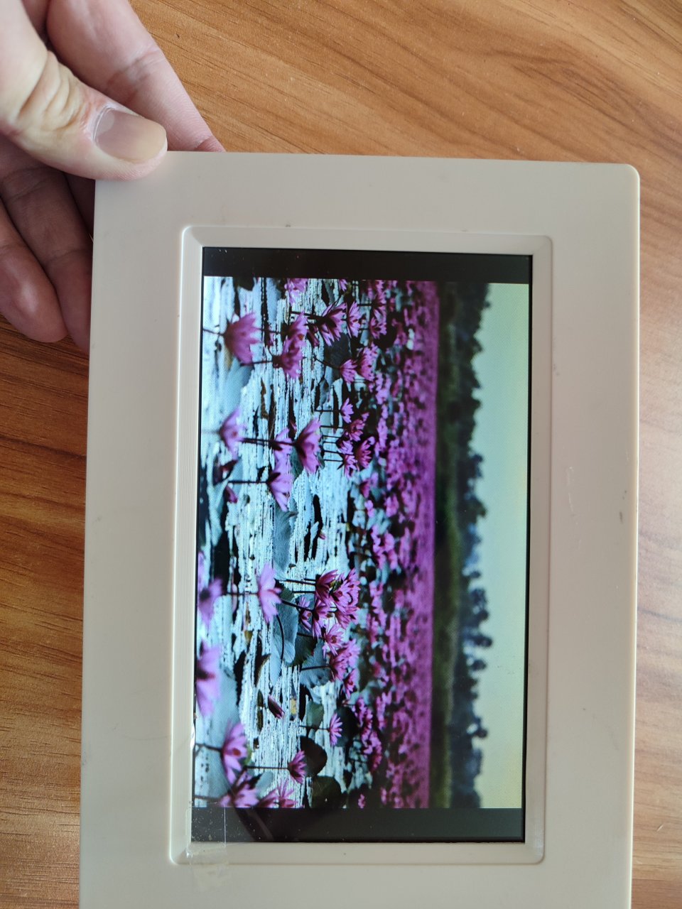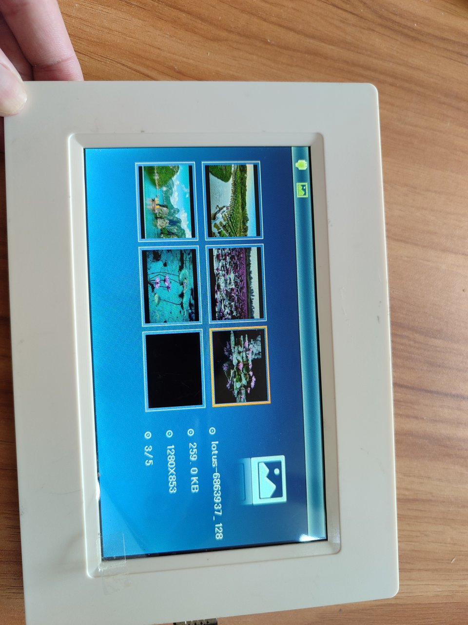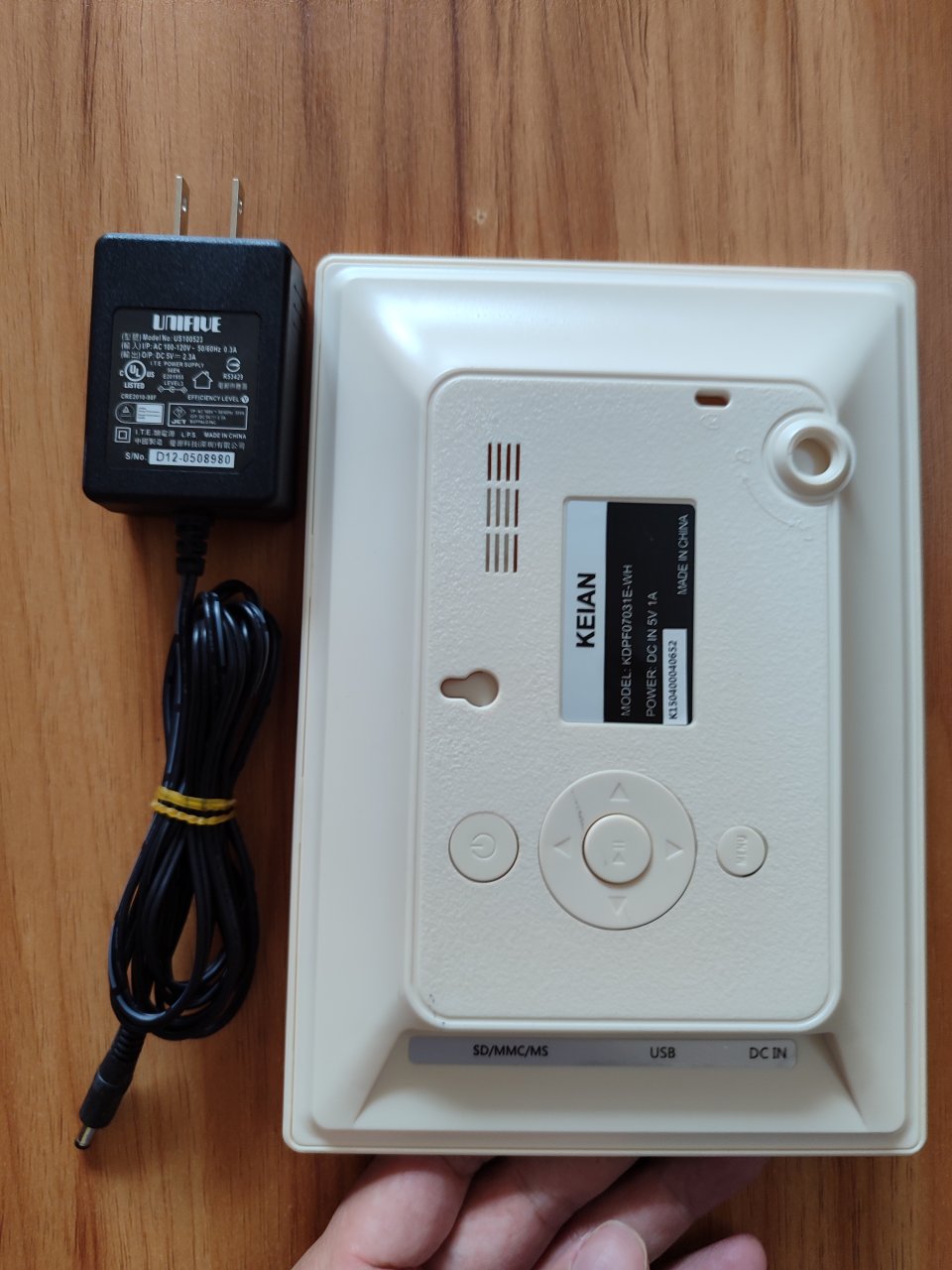Khung ảnh kỹ thuật số Keian 7 inch, màn hình đẹp, hoạt động tốt, màn hình chưa bó seal, bị mất thanh đỡ phí sau, có ngôn ngữ tiếng Anh Adapter dùng điện 100V.