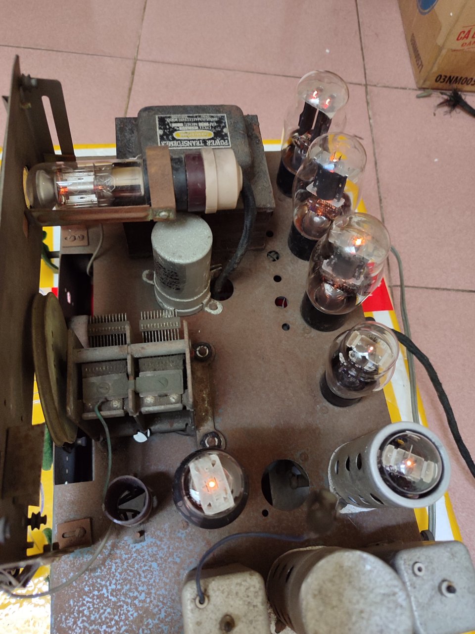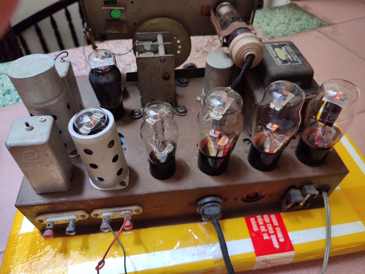 Radio bóng đèn cổ, hàng Nhật, dùng điện 100V, cắm điện sáng đèn, sáng 7 bóng. Có tất cả 8 bóng, nhưng 1 bóng bị tuột chân (hình cuối). Giá 1.6tr cho ae thợ về dọn lại