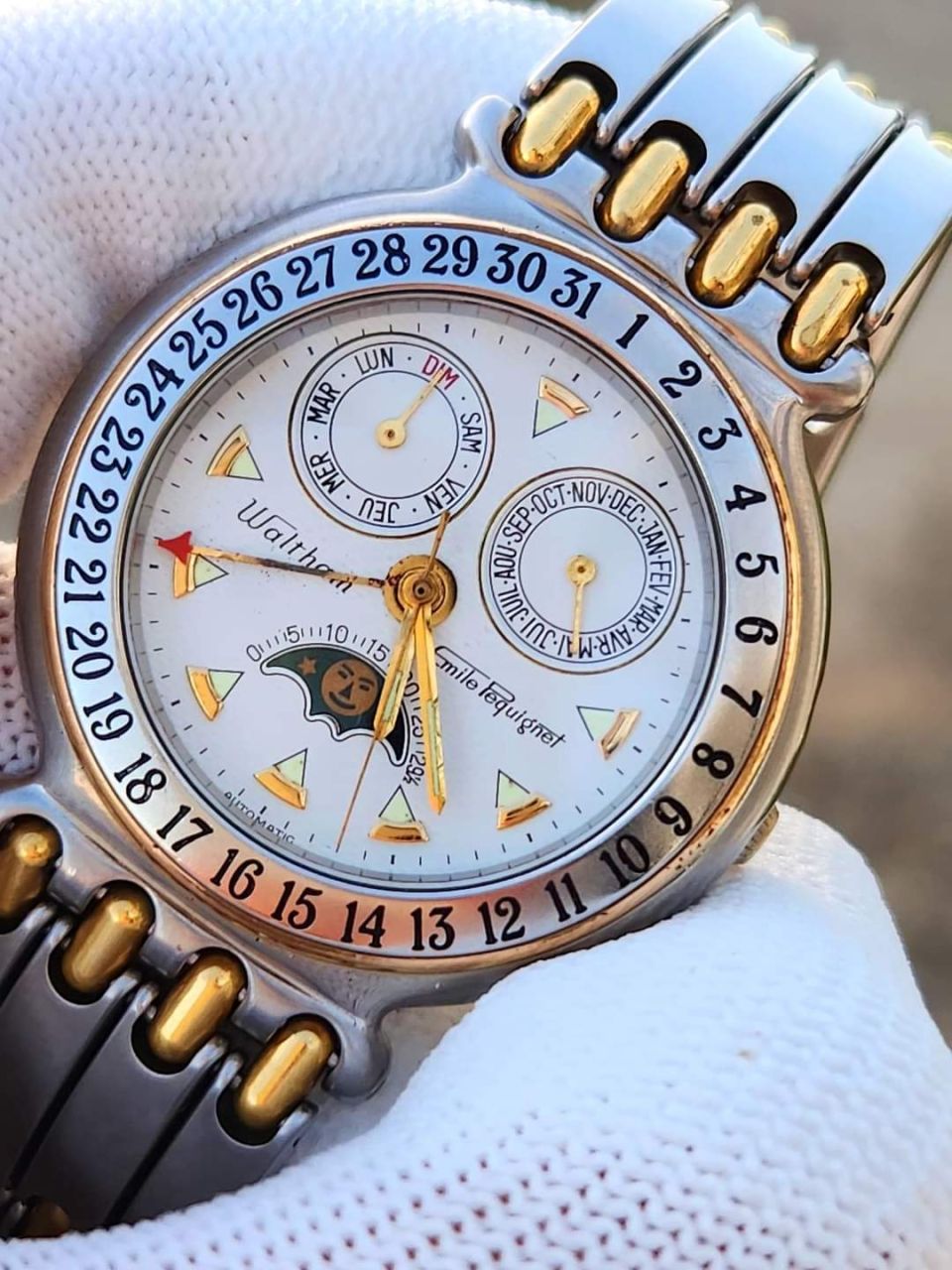 Đồng hồ nam hiệu Emile Pequignet Tripe Calenda Máy Automatic 2892. Size 37mm. Toàn thân ss demi bọc vàng rất đẹp, zin nguyên comple cả dây khóa luôn nhé. Đồng hồ đc thiết kế rất tinh xảo và đẹp.