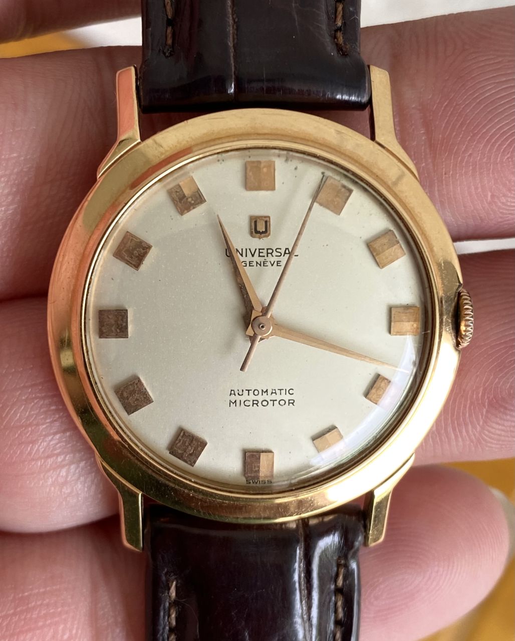 Giao lưu Đồng hồ Universal Automatic 18K750 Gold Rose swiss made. Nguyên zin rất mới đẹp long lanh chính hãng thuỵ sỹ sản xuất. Chưa hề qua xử lý hay đánh bóng.