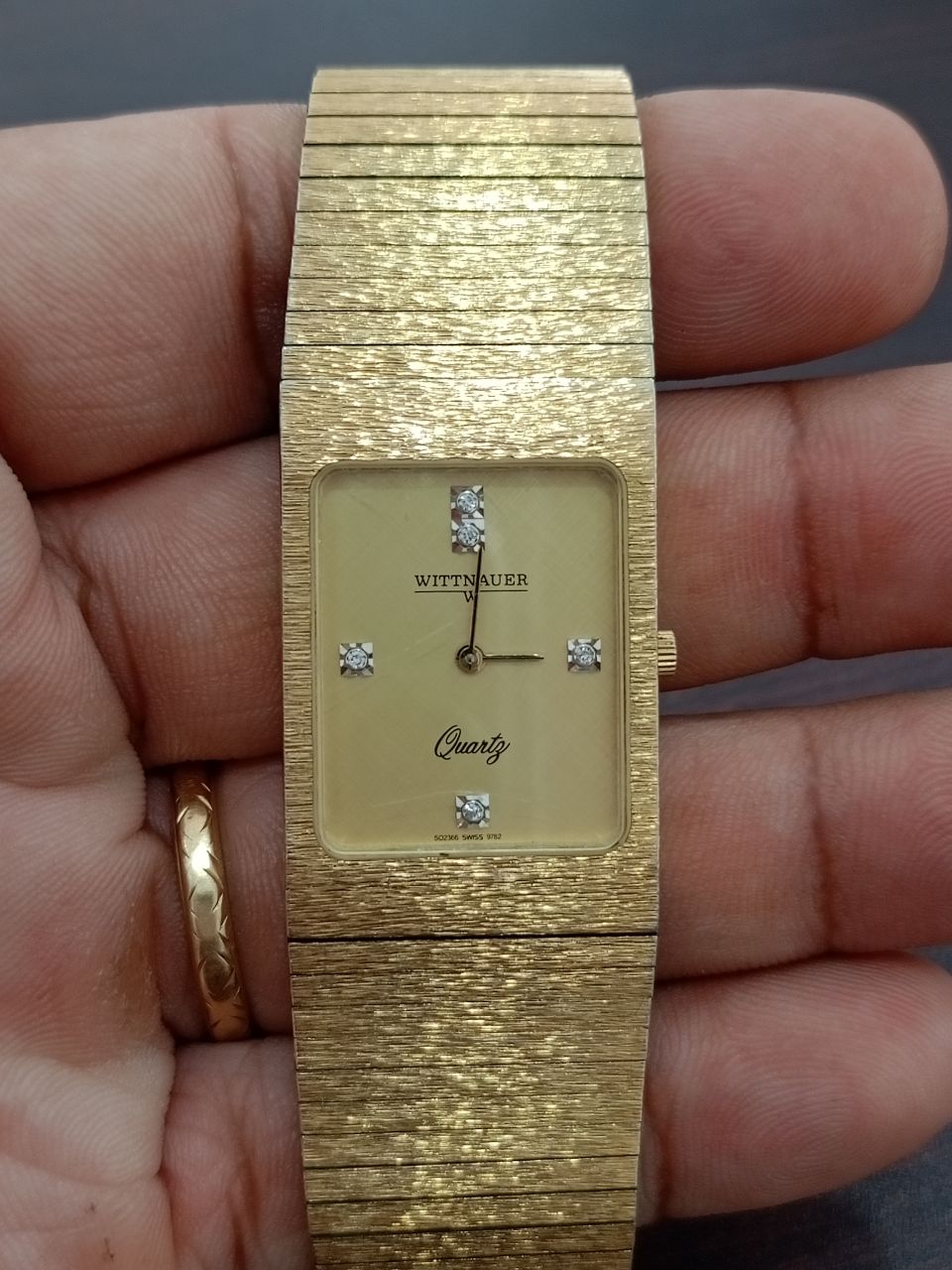 Đồng hồ WITTNAEUR thương hiệu Mỹ được sản xuất tại Thủy Sỹ. Dây vs Vỏ đc bọc vàng nguyên con, mặt đính 5 hạt xoàn thiên nhiên rất đẹp. Size 23 x 34mm. Nam tay nhỏ đeo đẹp, còn nữ tay lớn đeo cũng rất đẹp nhé, máy đc bọc vàng nguyên con nên cầm rất đầm tay. Các Bác đeo lên tay rất thời trang và sành điệu.