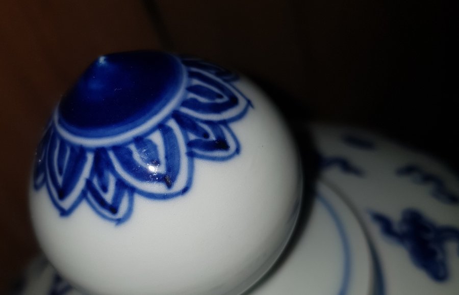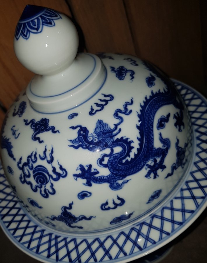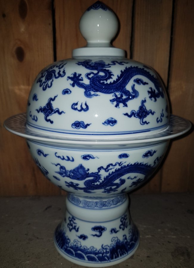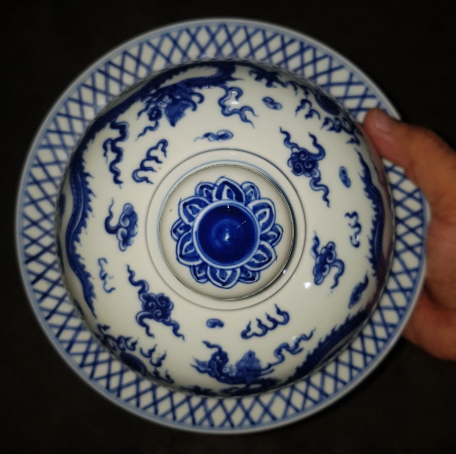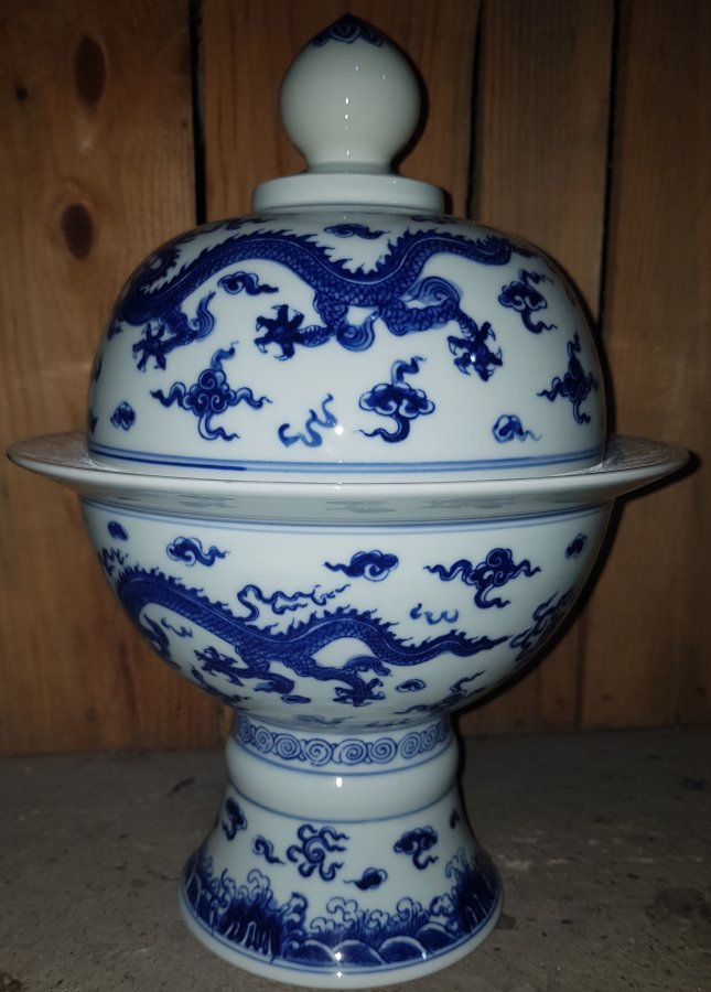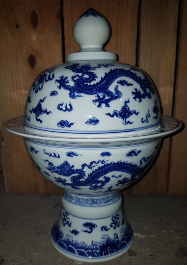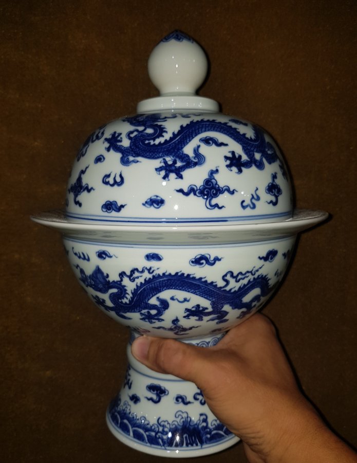 Đài sứ vẽ rồng Vương Quyền Uy Dũng bên ngoài thực tế vô cùng cuốn hút. Cao tổng thể 32.5cm. vành miệng ngoài lớn nhất 21.8cm. Lành lặn. GL3950k
