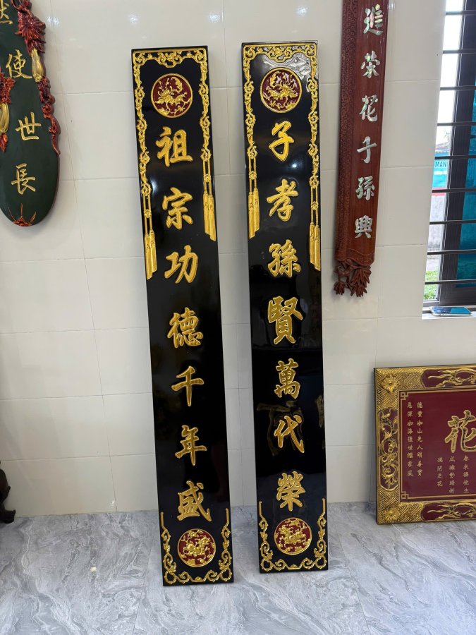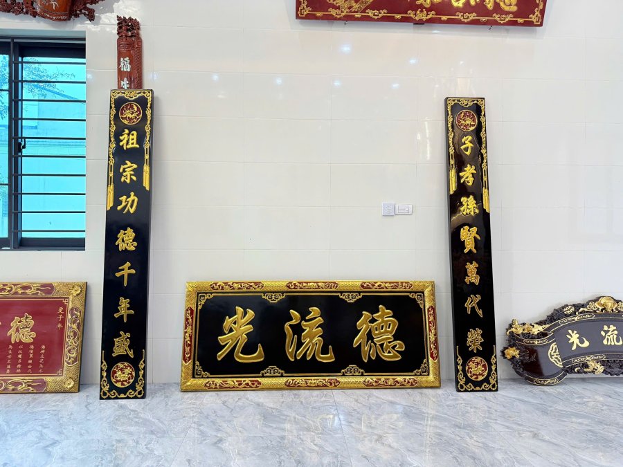 Đại tự đức lưu quang Kt : 1m70 x 70 x 5 Câu đối : 197 x 27 x 4 Dịch: tổ tông công đức thiên niên thịnh Tử hiếu tôn hiền vạn đại vinh Gỗ dổi