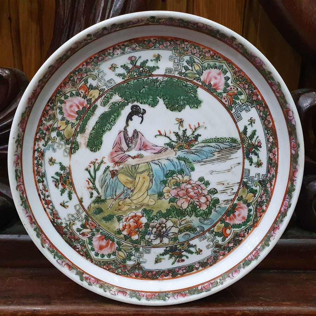Dầm trà xưa . Đồ Tàu đầu thế kỷ 20 . Vẽ tay thiếu nữ đàn bên hoa .