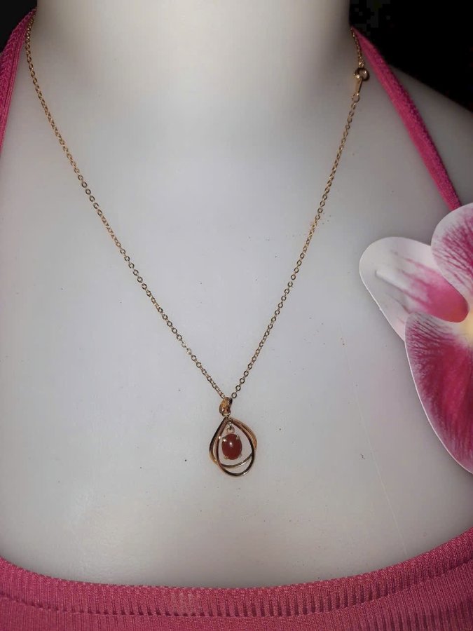 Vòng cổ có viên đá mã não đỏ hồng quá đẹp. Phối với áo trễ cổ thì càng đẹp hơn. Viên đá nhỏ bầu dục dài 8mm là 0,8cm.