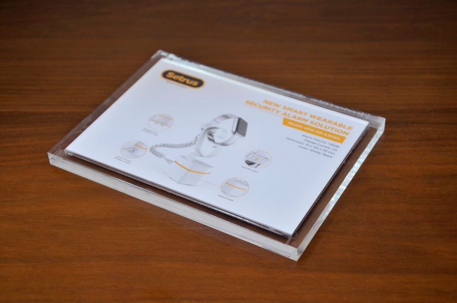 Đế mica kẹp bảng giá dạng nằm dùng để giới thiệu thông tin về sản phẩm và giá sản phẩm hoặc các tờ hướng dẫn, tờ quảng cáo sản phẩm được sử dụng đặt tại các quầy trưng bày, bàn trải nghiệm các sản phẩm kỹ thuật số...