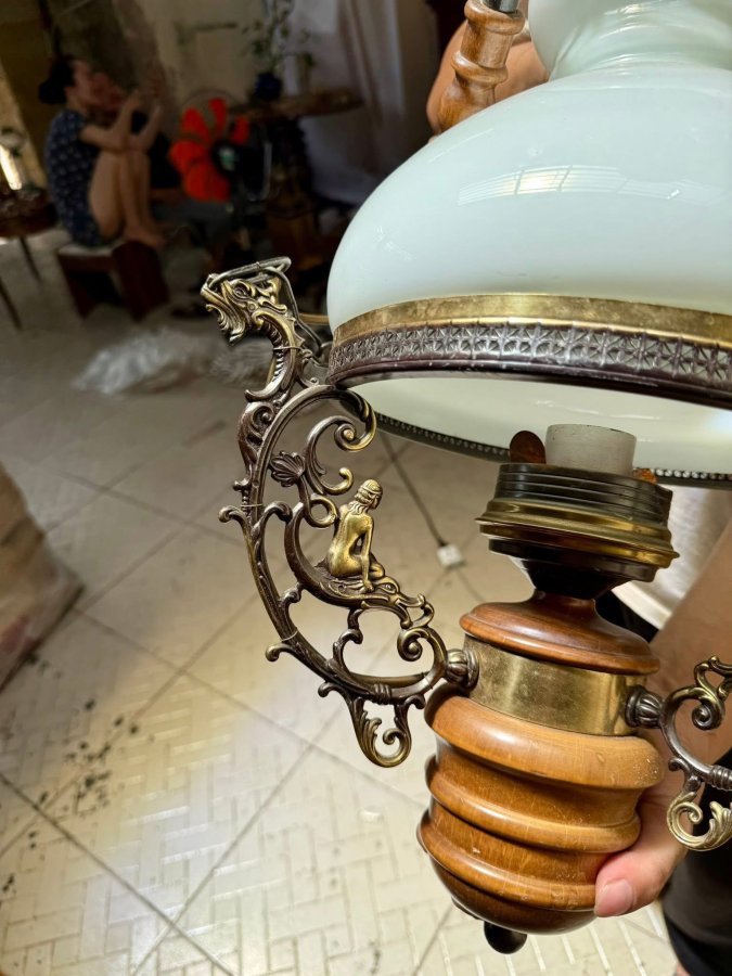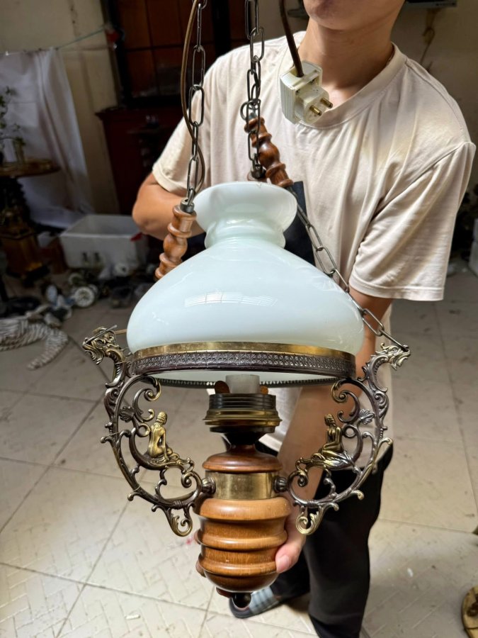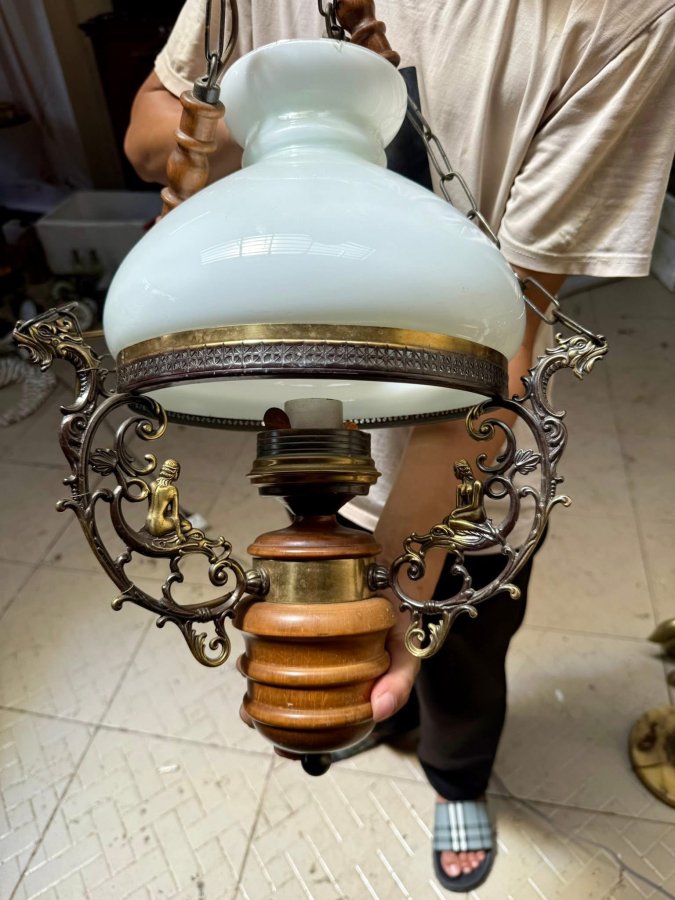 Chiếc đèn ba dây hàn cổ cực đẹp khung đồng có tượng rồng và cô gái phối với bầu gỗ làm đèn màu trắng bị mẻ một tí ở miệng một tí xíu nên bán rẻ cho anh em. Giá mềm:3tr2 Call:0333534345