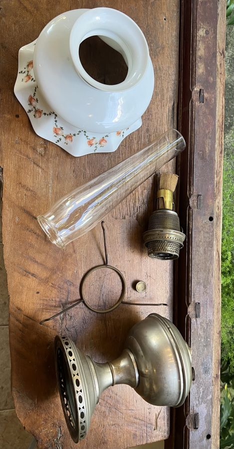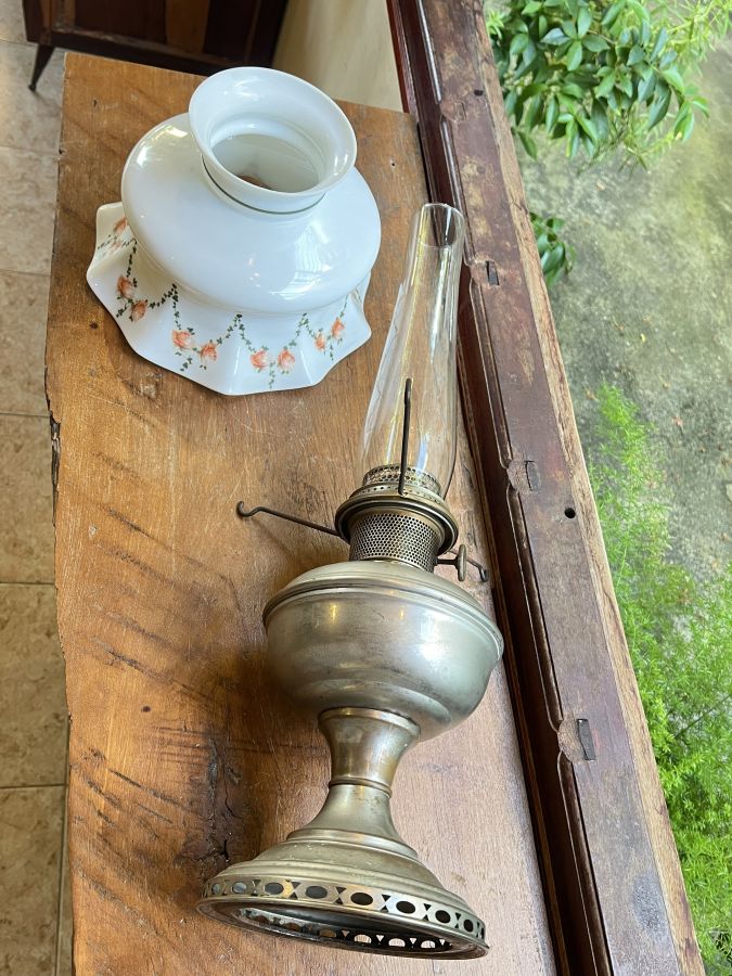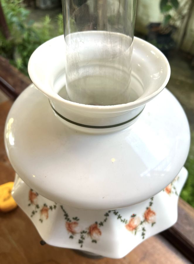 Đồng mạ Nikel trắng bạc. Chao thuỷ tinh dáng xoè vớt hoa văn Hoa hồng leo độc đáo.