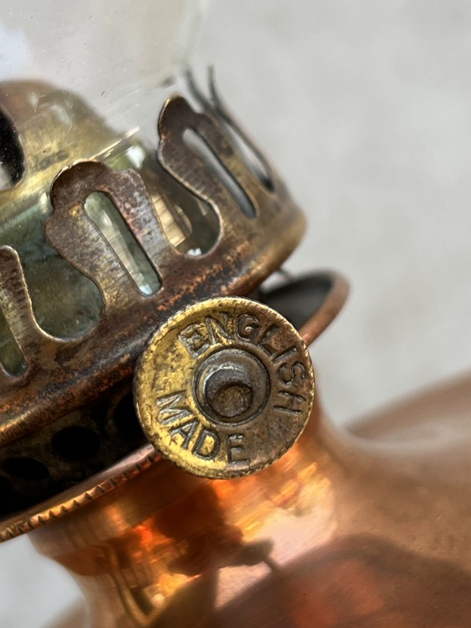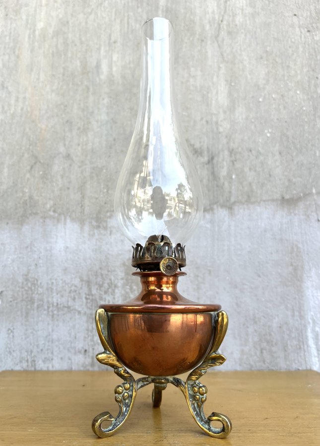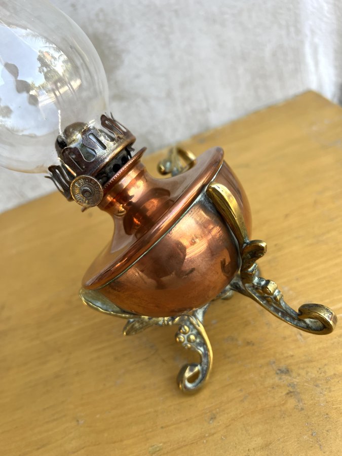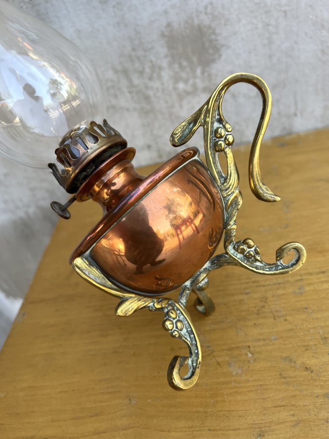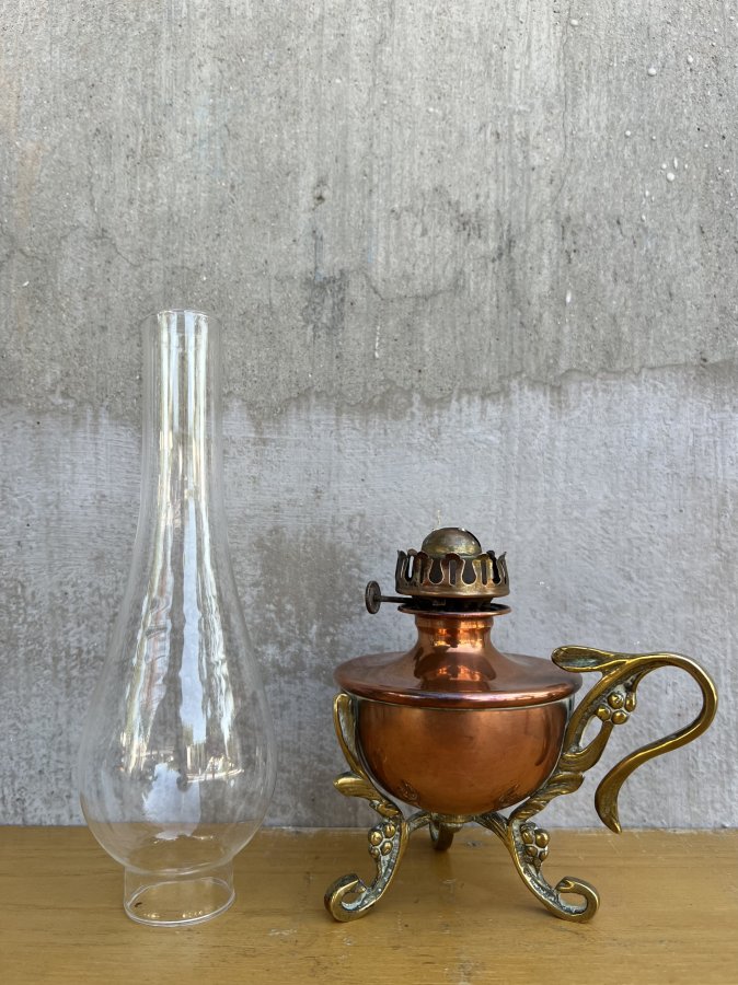 Em giao lưu đèn dầu Anh Quộc thiết kế độc lạ hiếm gặp. Bầu đồng đỏ 3 chân đồng thau đúc + quai cầm rất mềm mại đậm chất nghệ thuật ạ.
