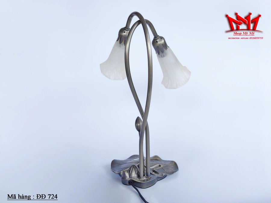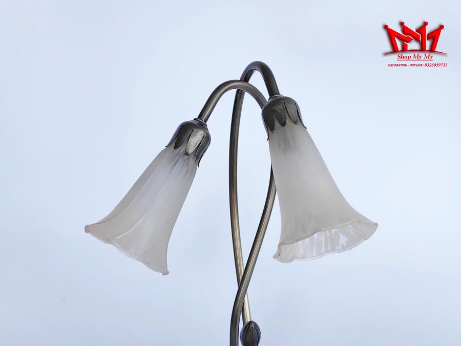 Chiếc đèn mô phỏng hình ảnh hai đóa hoa loa kèn đang vươn cao với phần chao đèn bằng thủy tinh trắng mờ uốn lượn mềm mại. Thân đèn được tạo hình từ hai cành hoa đan xen, mọc lên từ một chiếc lá sen cách điệu ở phần đế, tạo nên một tổng thể hài hòa, tràn đầy sức sống và đậm chất thơ.