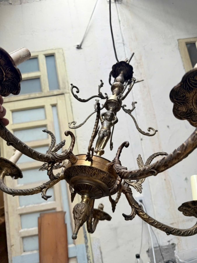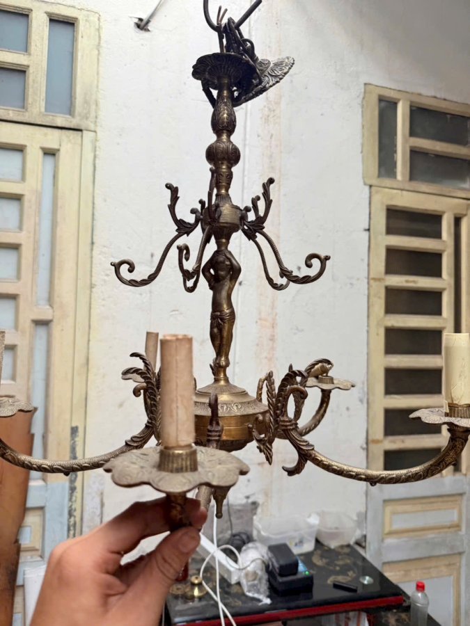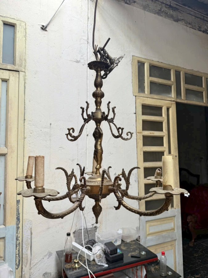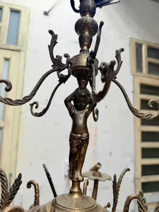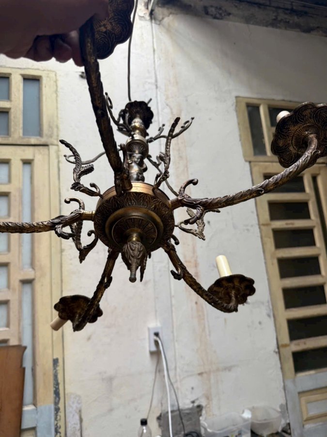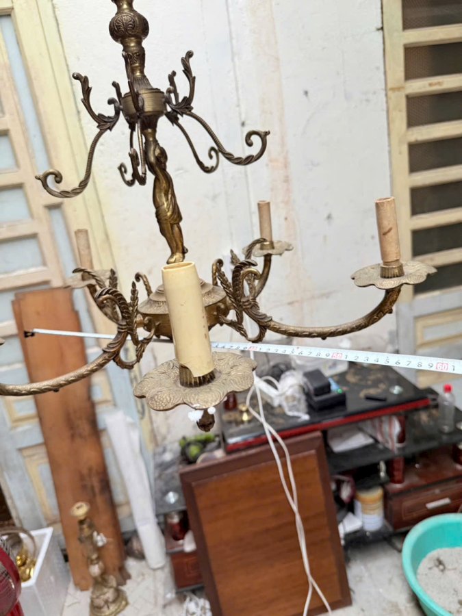 Đèn chùm pháp cổ lòi đồng đúc cầm nặng tay,hoa văn chi tiết có cuti cực độc màu vàng đồng xuống màu do lâu năm,em có nhận spa hoặc anh em tự spa cực kì đẹp không gãy hàn nối, Nguyên zin bụi tây Call:0333534345