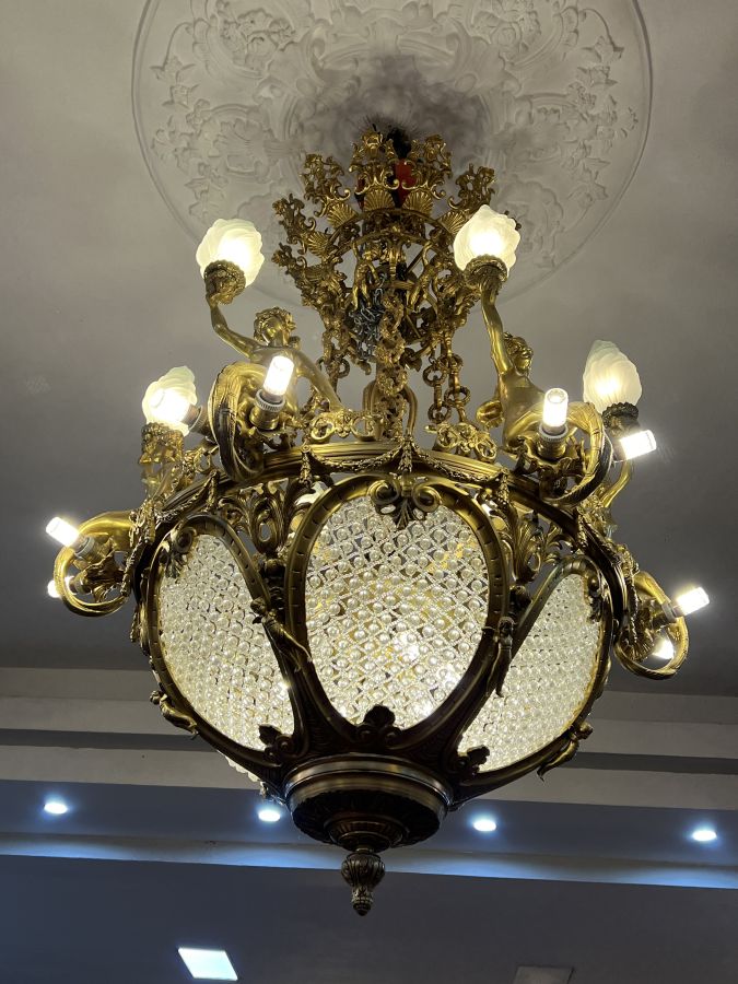 Dành cho không gian nhà rộngSâu 1,5m / Ngang 1,1mToàn bộ bằng đồng đúc kết hợp hạt pha lêMột tác phẩm đèn chùm rất đáng để sưu tầm