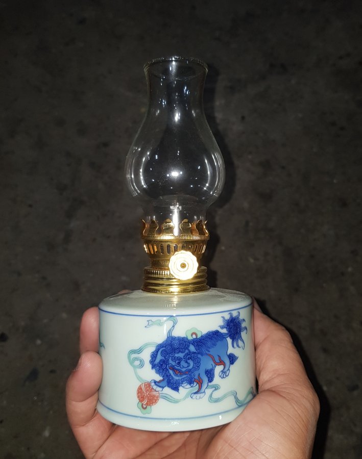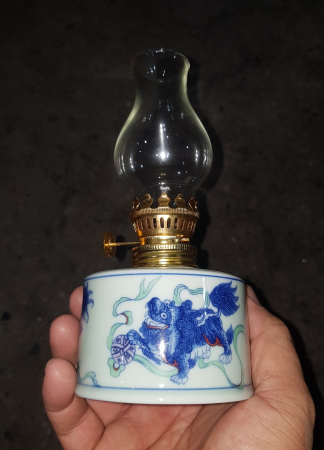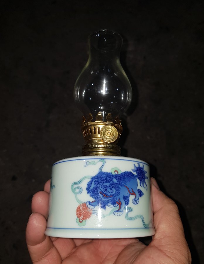 Đèn dầu bầu sứ hoạ pháp lân chàm h.uyết đỉ.a cao cả bóng 18cm. bầu 6x26cm. lành lặn. GL860k