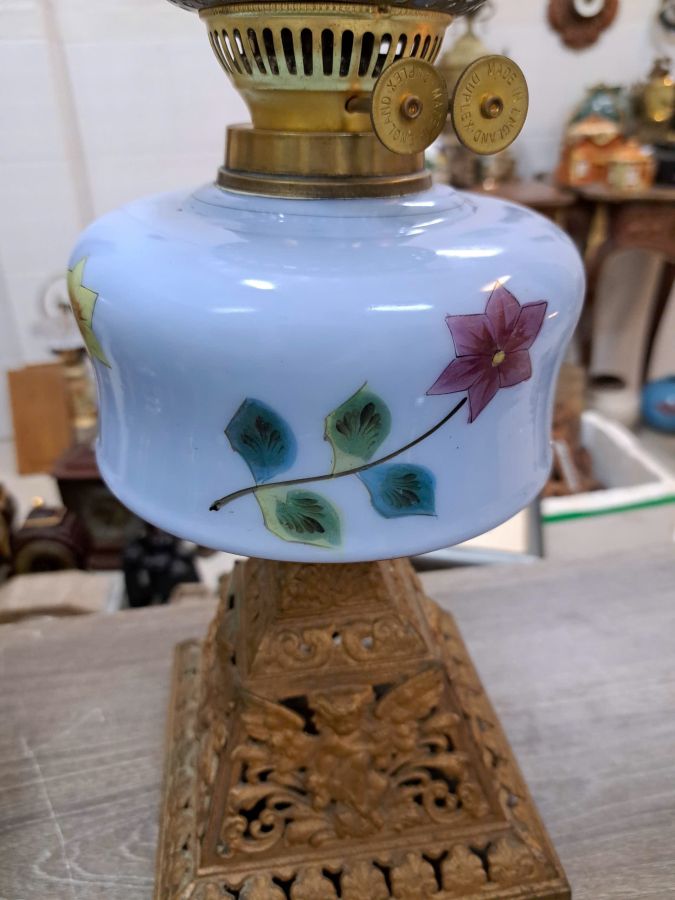 Đèn dầu cổ Anh Quốc _2 tim đènBầu thủy tinh màu, chân kim loại, lam hoa.C 54cm, N 20cm (lam), bầu 15cmGiá: 3,5trZalo: 0862.144.188