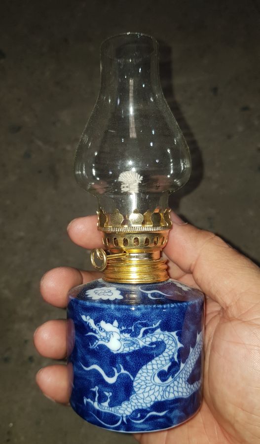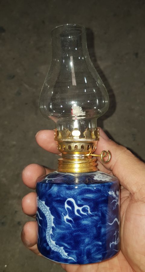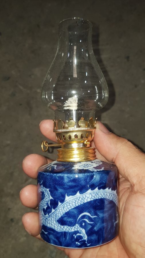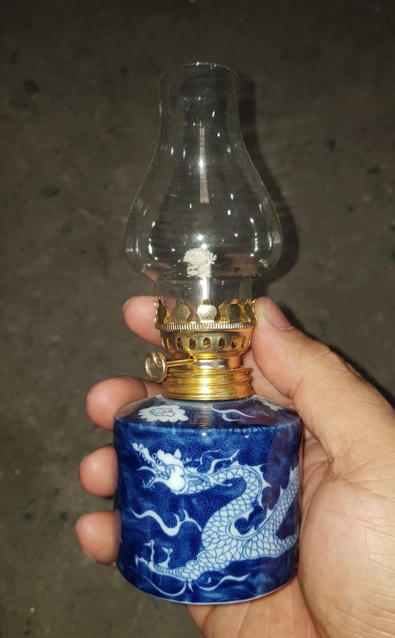 Đèn dầu sứ long ẩn có chiều cao cả bóng 16cm. vòng bụng 20cm. lành lặn. về chỉ việc đổ dầu vào là thắp lên. GL680k