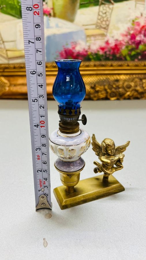 Đèn dầu mini Pháp, thân đúc đồng, họa tiết thiên thần, bóng kính xanh coban. Hàng hiếm, kích thước nhỏ, phù hợp trưng bày tủ kính hoặc bàn làm việc.